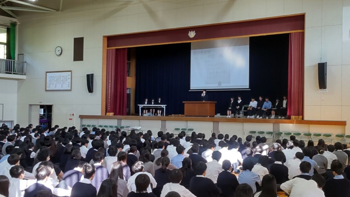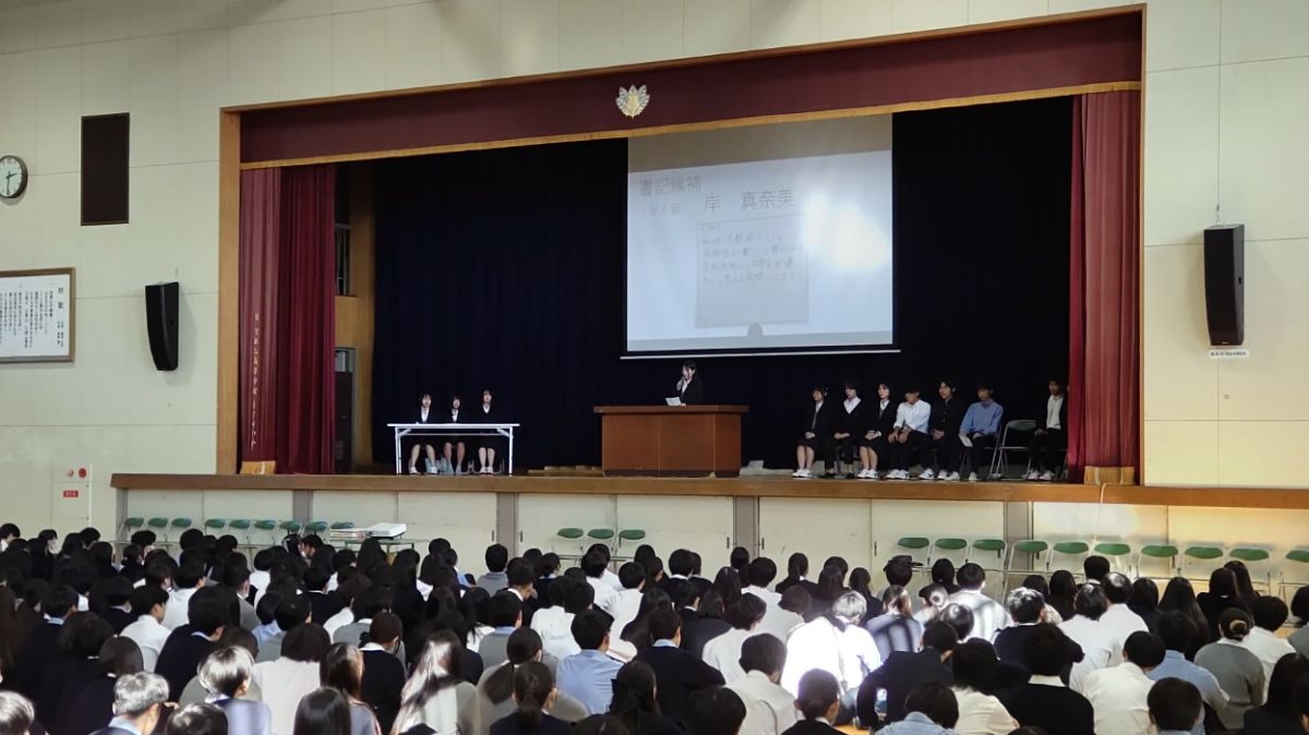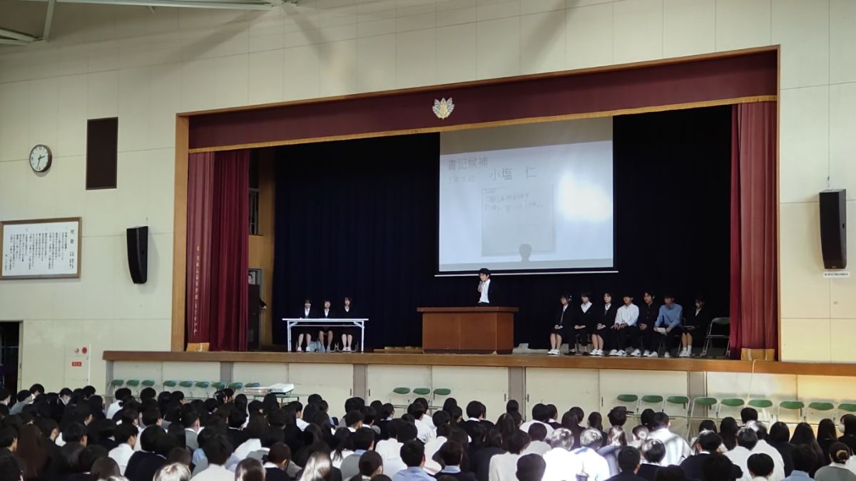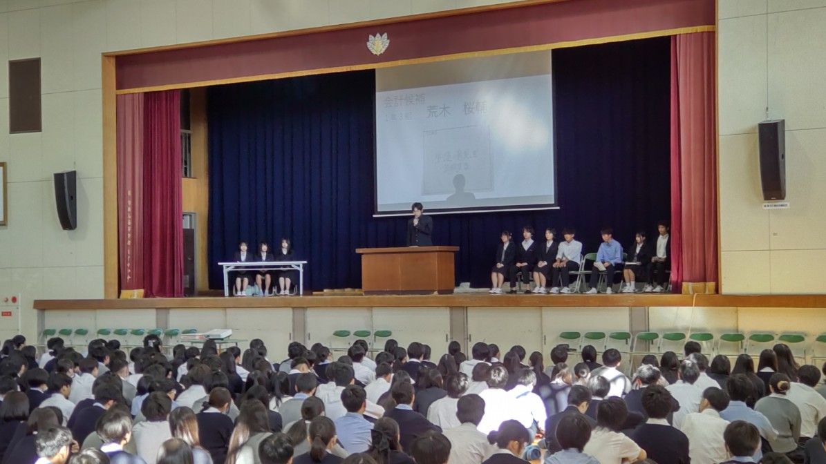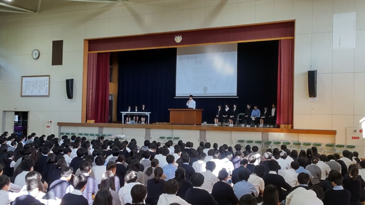 10月23日(木)6限、体育館にて後期生徒会役員選挙立ち合い演説会を行いました。今回の選挙では会長候補が2名立候補、副会長、書記、会計は定数内立候補でした。候補者それぞれが所信を表明。「屋上の開放」「アイスクリーム自販機の設置」「食堂でのペイペイ支払い」「インスタグラムによる学校紹介」「学校評価の向上」等、取り組みたい課題を一生懸命訴えていました。どの候補者も「刀根山高校を良くしたい」という思いにあふれ、演説が終わるたびにたくさんの拍手をもらっていました。最後に前期生徒会会長が「これまでの生徒会への応援のお礼、後期の新しいメンバーへのバトンタッチ、刀根山サミットに向けての取組み、清き一票の依頼」をして締めくくってくれました。