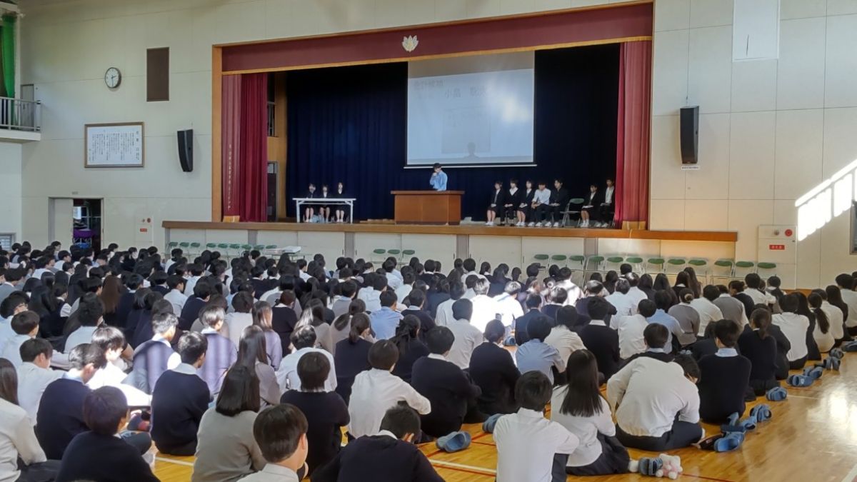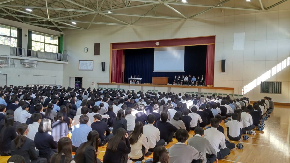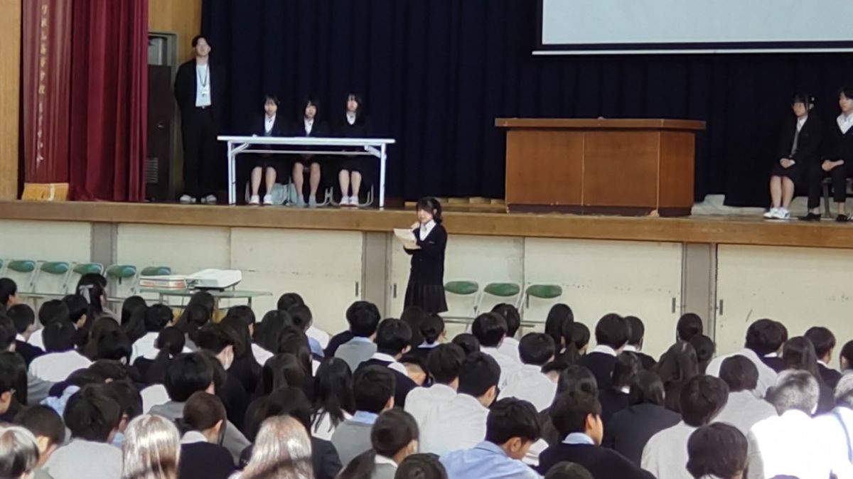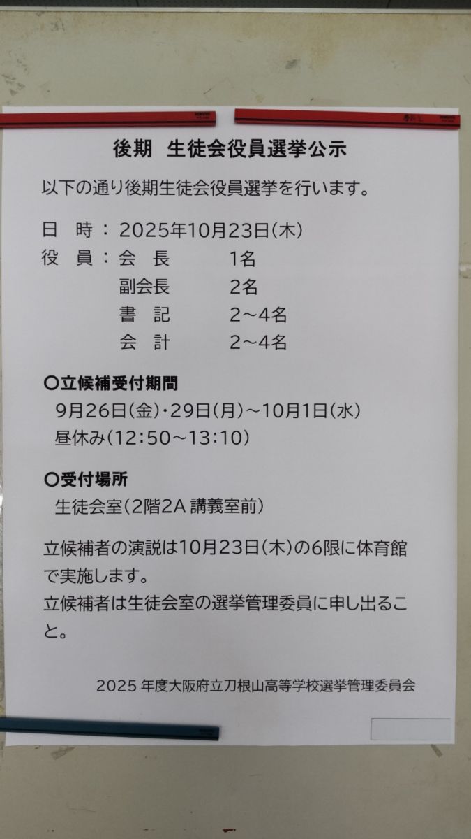 10月23日(木)6限、体育館にて後期生徒会役員選挙立ち合い演説会を行いました。今回の選挙では会長候補が2名立候補、副会長、書記、会計は定数内立候補でした。候補者それぞれが所信を表明。「屋上の開放」「アイスクリーム自販機の設置」「食堂でのペイペイ支払い」「インスタグラムによる学校紹介」「学校評価の向上」等、取り組みたい課題を一生懸命訴えていました。どの候補者も「刀根山高校を良くしたい」という思いにあふれ、演説が終わるたびにたくさんの拍手をもらっていました。最後に前期生徒会会長が「これまでの生徒会への応援のお礼、後期の新しいメンバーへのバトンタッチ、刀根山サミットに向けての取組み、清き一票の依頼」をして締めくくってくれました。