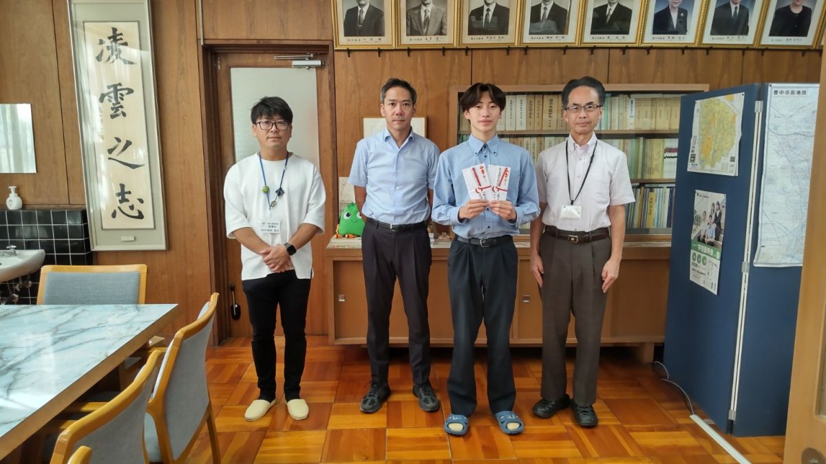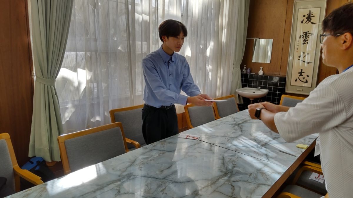 9月30日15時40分より校長室にて、水泳部近畿大会出場激励会を行いました。水泳部の2年生濵﨑光聖君が9月20日に「Asue大阪プール」で行われた「大阪高校新人水泳大会」男子200m個人メドレーで2分14秒22、「近畿大会標準記録」2分19秒39を超え5位入賞しました。10月11日・12日、滋賀県草津市の「インフロニア草津アクアティクスセンター」で開催される「第9回近畿高等学校新人水泳競技大会」に出場します。本日はPTAおよび後援会から出場のお祝いと激励金の贈呈が行われました。濵﨑君は「大会当日は考査期間中ですが、しっかり水泳に取り組みます。また、考査についても大会に出たことを理由に点が取れなかったということがないよう、両方とも頑張ります。」と頼もしい挨拶をしてくれました。まさに文武両道の実践者です。おめでとう濵﨑君!近畿大会でも大いに活躍してください!