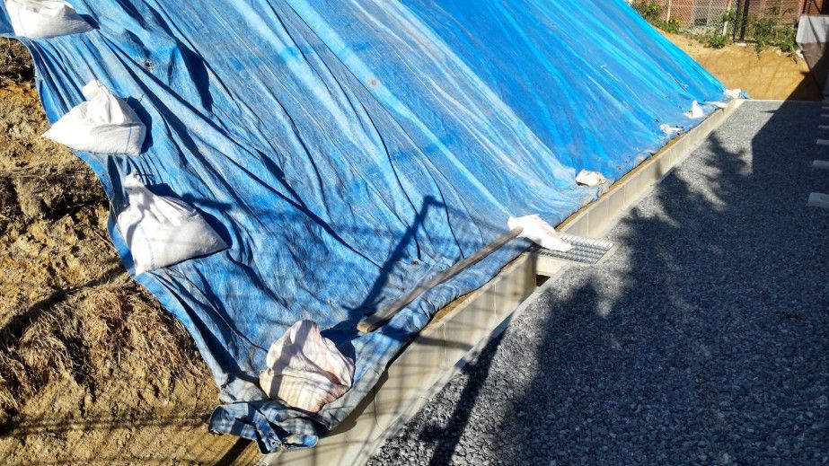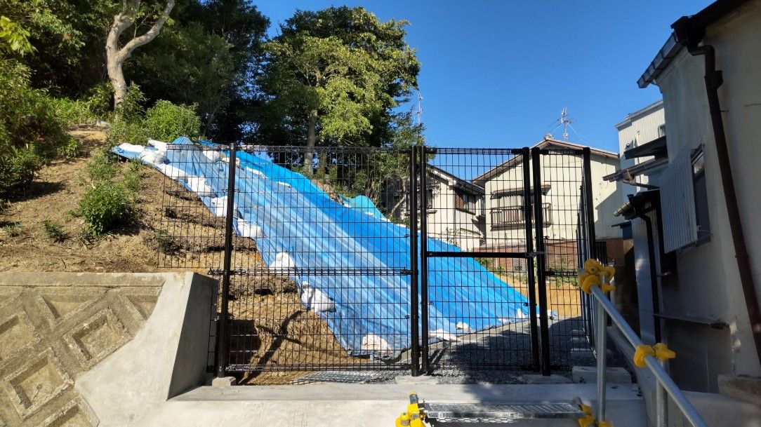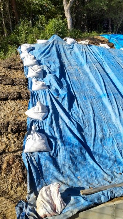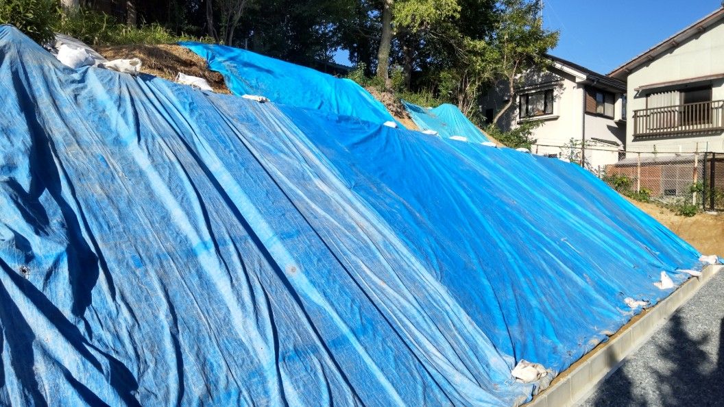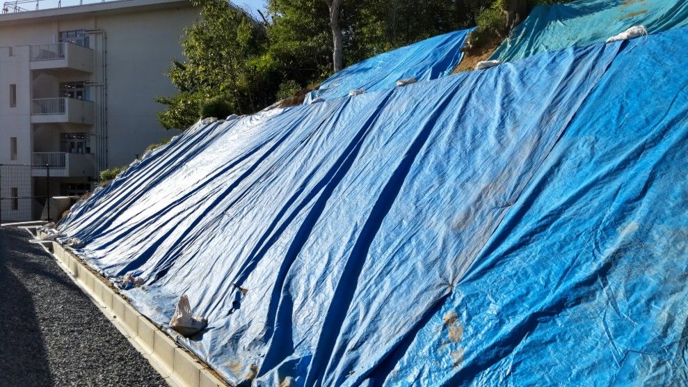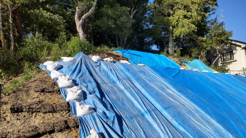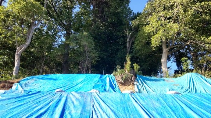 10月6日(月)東法面で台風対策を行いました。東法面工事は終了しましたが、法面にはまだ植物が生えていないので、地肌が露出しています。台風など大雨が降れば地表の土砂が流出する恐れがあるので、技師さんと事務職さんが急遽、材料を整え作業に取り掛かってくれました。法面にブルーシートを張り、土嚢を設置する作業。日中はまだまだ暑く、汗をかきながら大変な作業でしたが、台風や大雨に十分対応できるいい仕事をしていただきました。