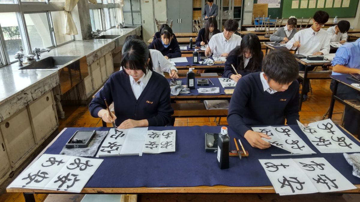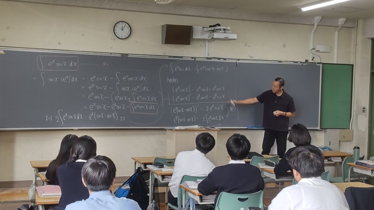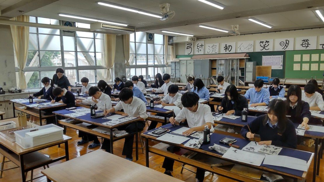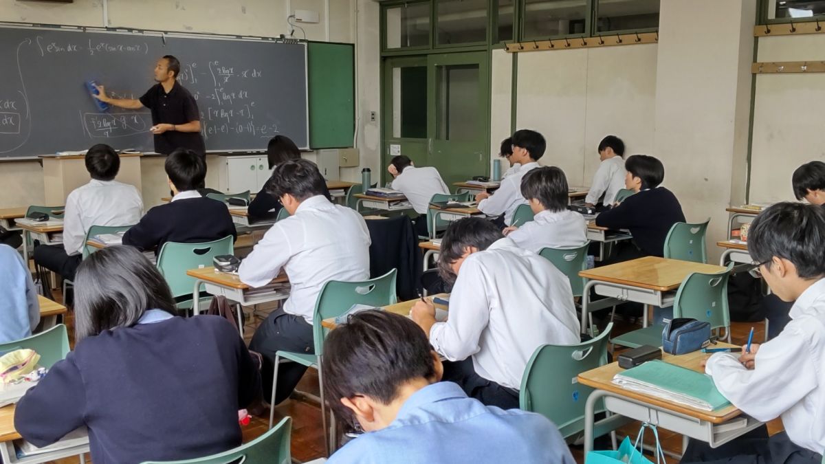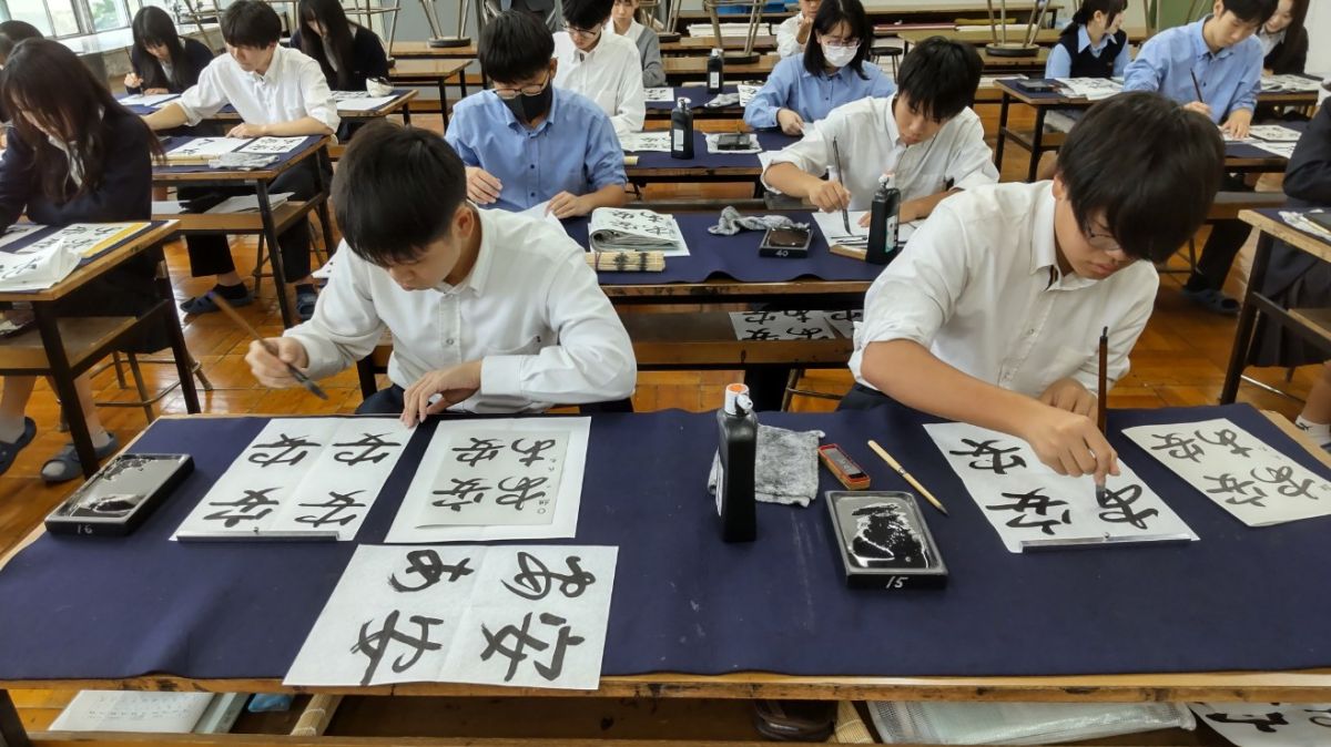 10月21日(火)2限に書道Ⅱ、4限に数学Ⅲの授業を見学しました。書道Ⅱは「草書」に挑戦。先生の説明を聞いて草書の特徴を理解すると生徒たちは作品に取り掛かります。姿勢もよく見事な筆さばきを見せる生徒も。静かで厳かな雰囲気の中、生徒たちは書の世界に浸っていました。数学Ⅲは「部分積分」の授業でした。文系の私にはまったくわからない。先生の板書を理解する生徒たちがこれまた偉大に見えました。生徒たちの集中力、見事です。