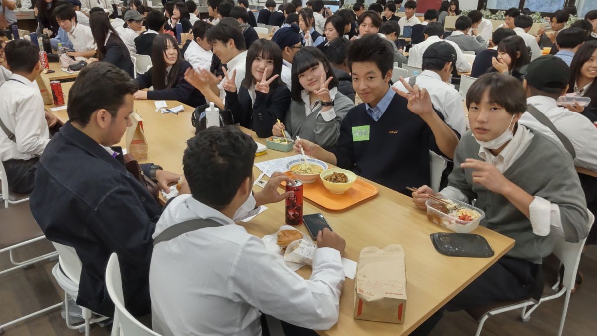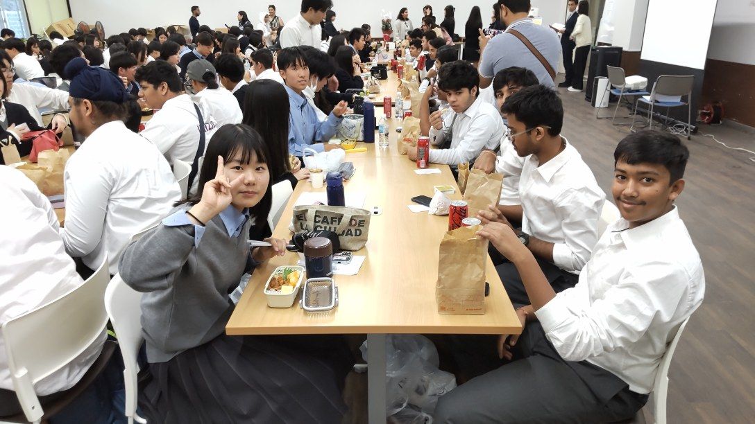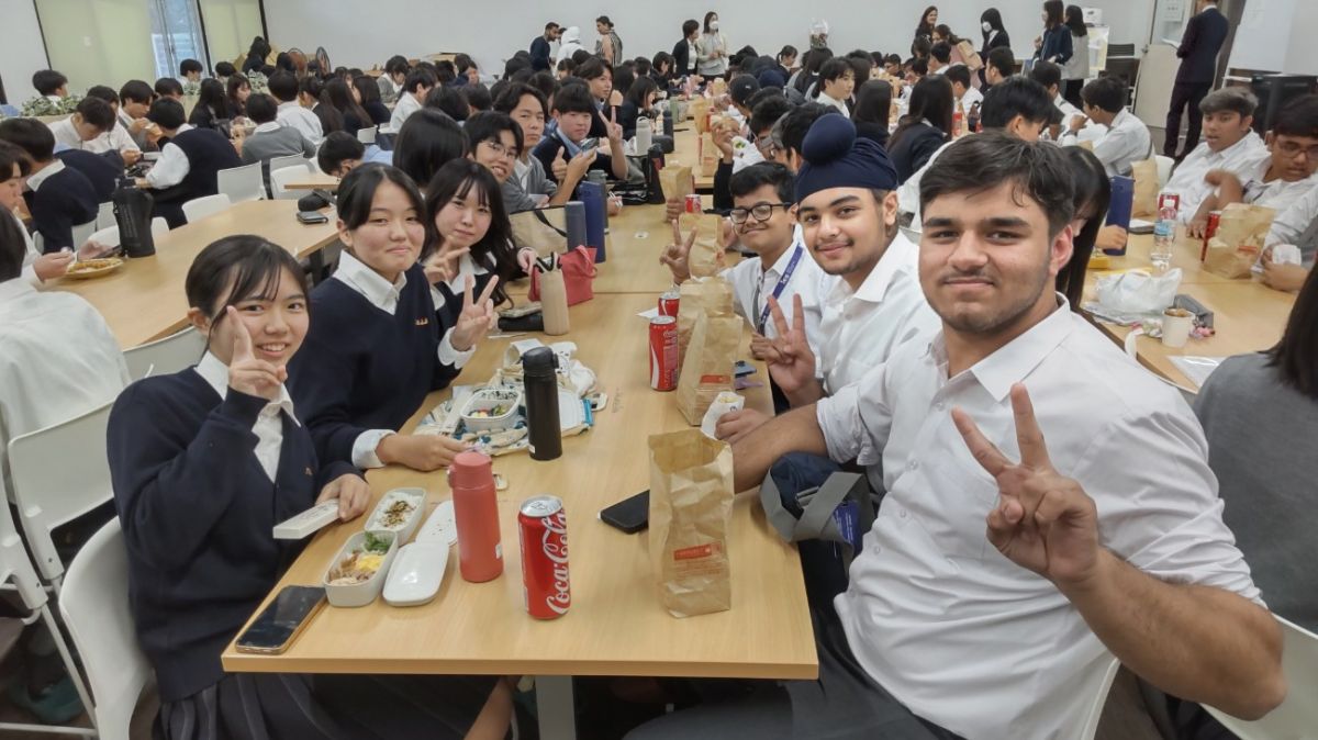 歓迎式典の後はランチタイム。バディと一緒に食事をします。はじめは少し緊張していましたが、だんだんと慣れて会話も弾みました。インドの生徒たちは食べて良い食材、いけない食材があるので、事前にセントジョンズ高校が準備した某ハンバーガー店のハンバーガーセット。本校生のお弁当や食堂のメニューの品を珍しそうに見ながら、いろいろ質問も。