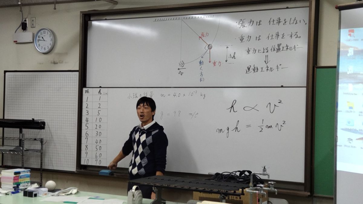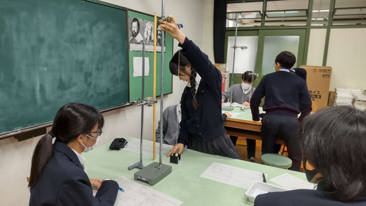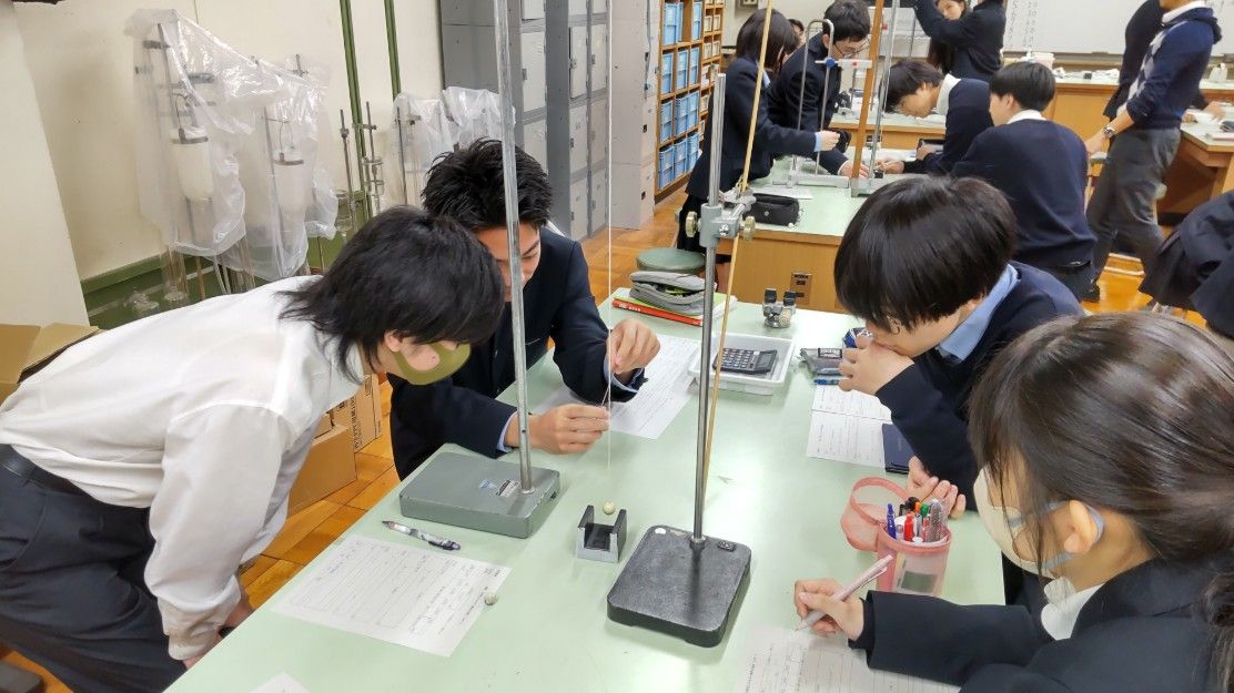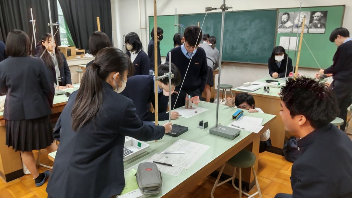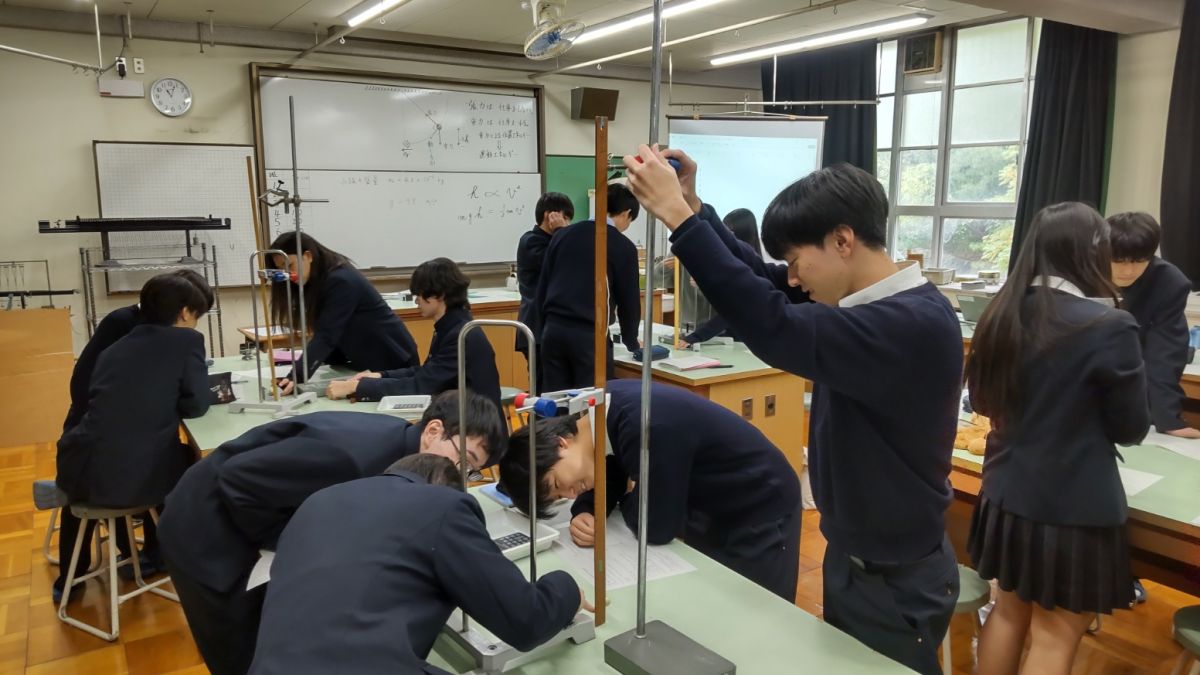 11月13日(木)3限、2年生の物理基礎の授業を見学しました。今日の授業は実験ということで物理実験室での実施でした。「力学的エネルギー保存の法則」について、フリコ運動により確かめるという実験です。はじめに先生から運動エネルギーと位置エネルギーの関係について説明があり、各班の机の上に用意された器具の使用法や測定法についてお話しがありました。先生のお話の後、生徒たちはどんどん準備を進めていきます。ビースピ(スピードを測る器具。私はこのような器具があることを今日初めて知りました。またもやワクワクです。)やスタンド・フリコを適正な位置にセット。実験開始。うまくいかずに悲鳴のような笑い声が上がったり、うまく決まってガッツポーズをする生徒。記録を取りながら、早くも予測を立てている生徒。実験はみな真剣かつ楽しく取り組んでいました。データが集まると先生に報告。先生が集約したデータをパソコンで示すと綺麗な放物線が。それを二乗すると直線に。一同感動しました。2年生物理基礎では学期に1回は実験をするそうで、教科書やバーチャルではなく実物にふれる実験をしていただくことで、生徒の物理への興味関心はいっそう高まると思いました。