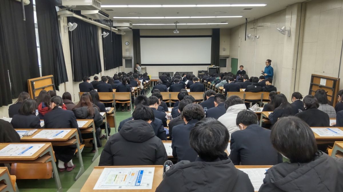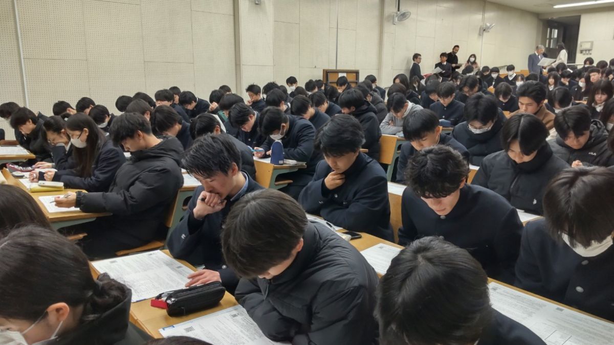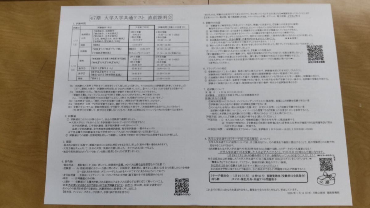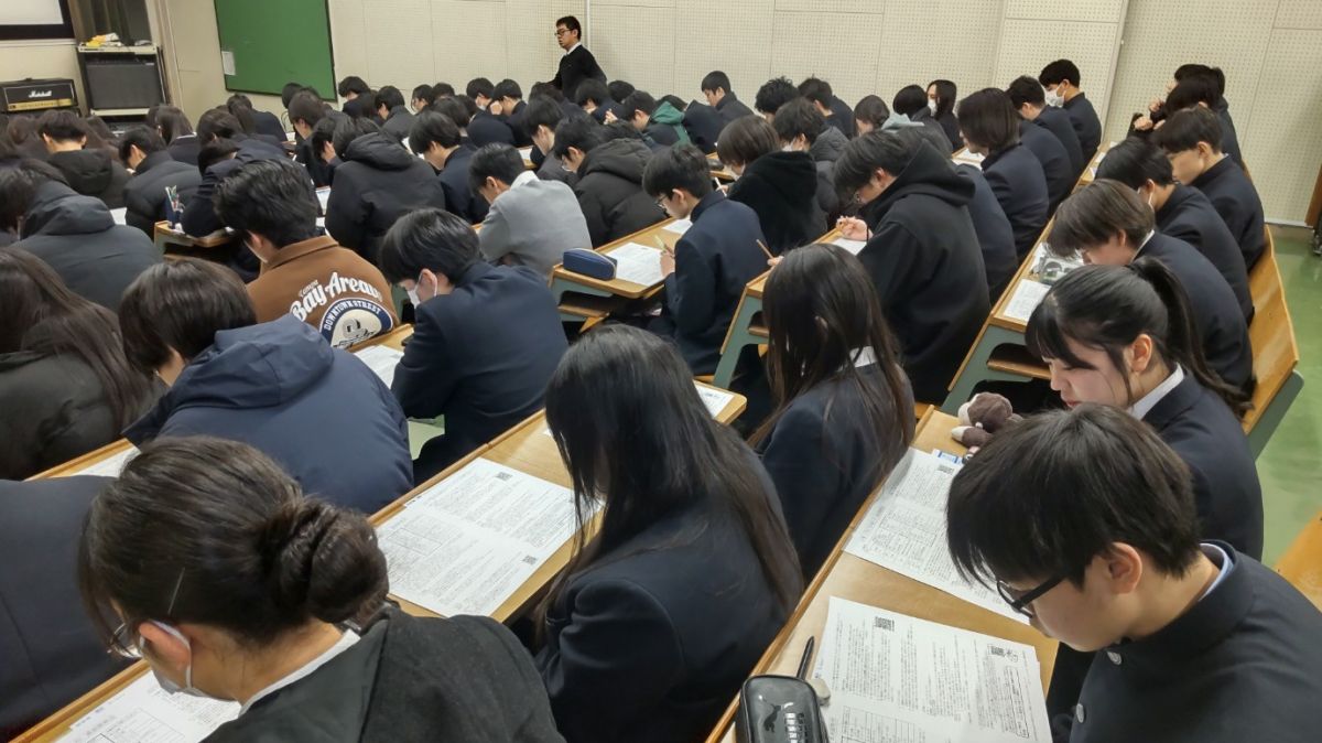 1月15日(木)12時30分より、視聴覚教室にて「大学入学共通テスト直前説明会」が開催されました。進路指導部長の先生が試験場、試験時間、服装、持ち物など基本的な事項のほか、試験中に留意すべきこと、アクシデントの対応など、受験する生徒が心得ておくべきことを丁寧にわかりやすく説明してくださいました。配付されたプリントは「今日やるべきこと」「前日・当日の過ごしかた」「試験会場に向かう道中」「会場についたら」「集合時間になったら」「試験が始まったら」等、チェック☑形式で示され、これをすれば絶対大丈夫という安心が得られるようになっています。また、先輩のアドバイスとして昨年受験した46期の体験も掲載。この説明会を受ければ、17日18日の本番も大丈夫。プリントの終わりは「これまでの努力はあなたを裏切りません。最後まで全力を尽くせるよう、祈念しています」と進路指導部の先生のエールで締めくくられていました。