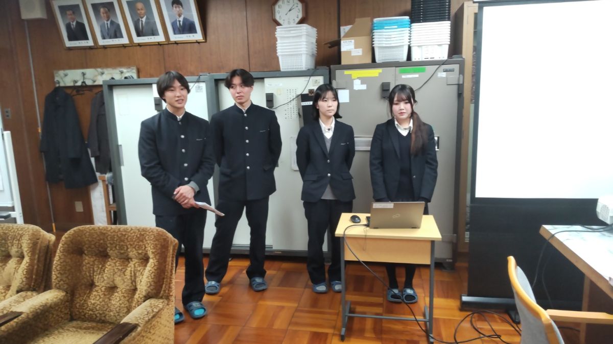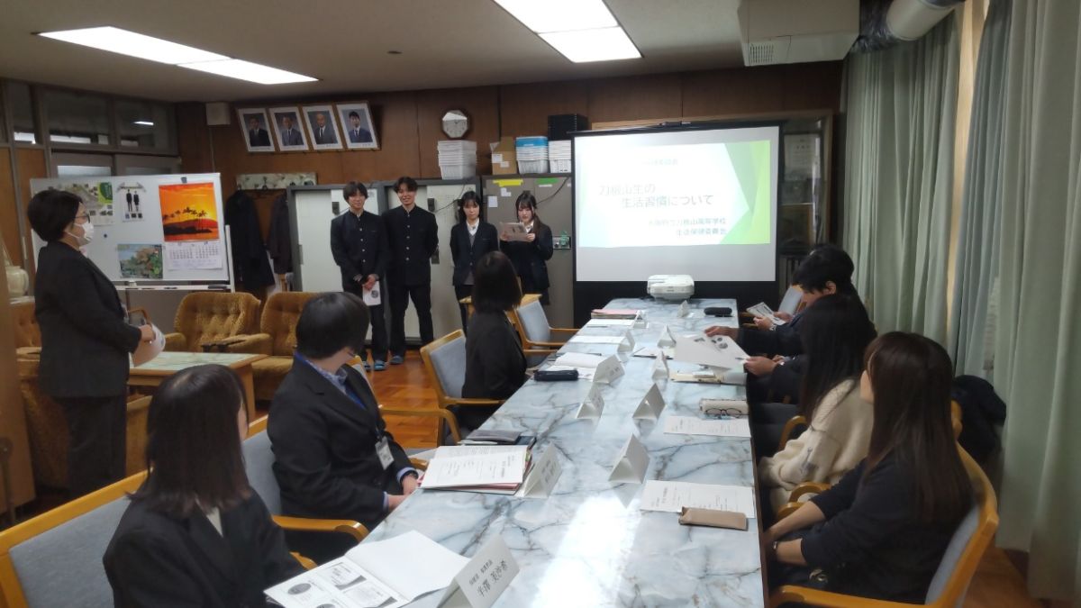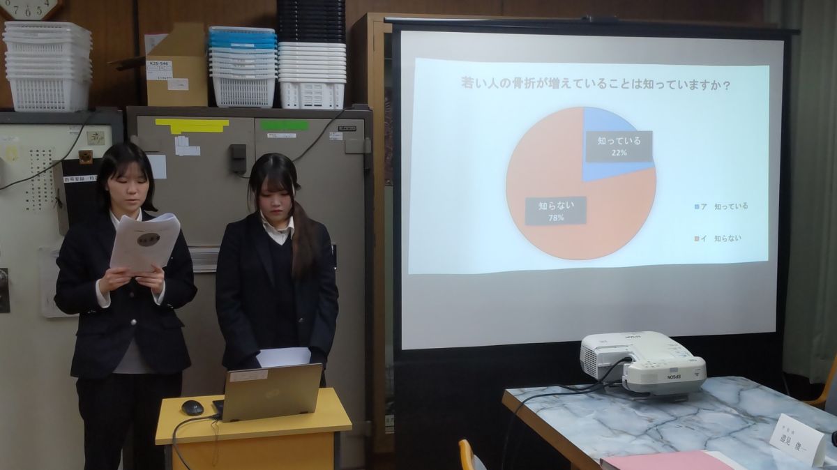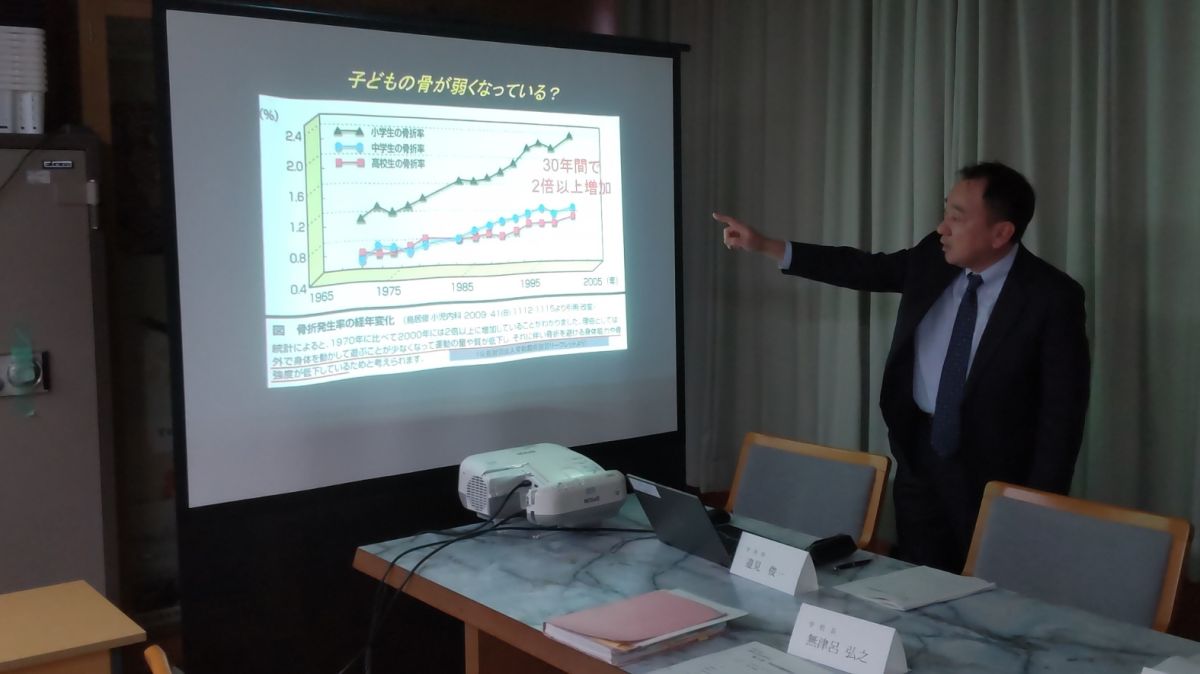 12月11日(木)14時から14時45分まで、第2回学校保健委員会(学校三師・PTA生活委員・校長・教頭・首席・保健主事・養護教諭・保健委員生徒)を校長室にて開催しました。会議では、生徒保健委員会報告、学校医の先生のご講演、養護教諭の報告が行われました。生徒保健委員会報告では、保健委員代表の2年生4名がプレゼンソフトを使って「刀根山生の生活習慣について」発表を行いました。刀根山生の食事、睡眠、スマホ利用、部活等の運動、生活習慣病等について、事前にとったアンケートをもとに分析し発表。しっかり準備をして本番に臨んでくれたので、大変わかりやすく、刀根山生の実態がよくわかりました。続いて学校医の邉見先生から「学童期における骨折と将来の骨粗しょう症予防」についてご講演をいただきました。子どもたちの骨が弱くなっている、転ぶときに手で支えられず顔から落ちる子、朝礼で立っていられな子、雑巾がけができない子、和式トイレが使えない子などバランスや柔軟性に課題のある子、骨の弱い子が増えている。骨端線損傷、不完全骨折、骨折や脱臼の際の不適切な治療の例、加齢による骨量の変化、若年者における予防などについて、実際の症例写真をもとにご説明いただいたので、理解がいっそうすすみました。1歳から4歳までの幼年期と10歳から17歳までの思春期に最大骨量を10%増加させれば骨粗鬆症の発症を13年遅らせることができるそうです。生徒のみなさん、今が大事ですよ!最後に養護教諭の村山先生から、生徒健康診断の結果分析、スポーツ振興センター申請状況、保健室利用状況、学校環境衛生調査結果等をご報告いただきました。大変内容の濃い、たくさんの学びのある会議となりました。発表者のみなさん有難うございました。