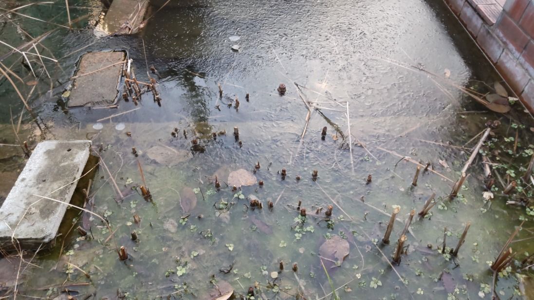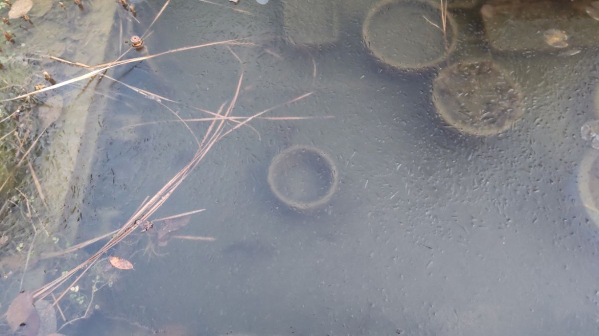 1月13日(火)、今朝は冷えました。ビオトープには氷が張っていました!魚の姿も全く見えません。寒いです。