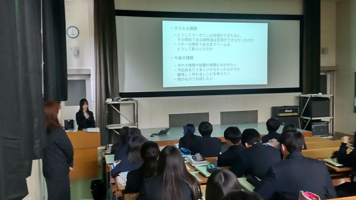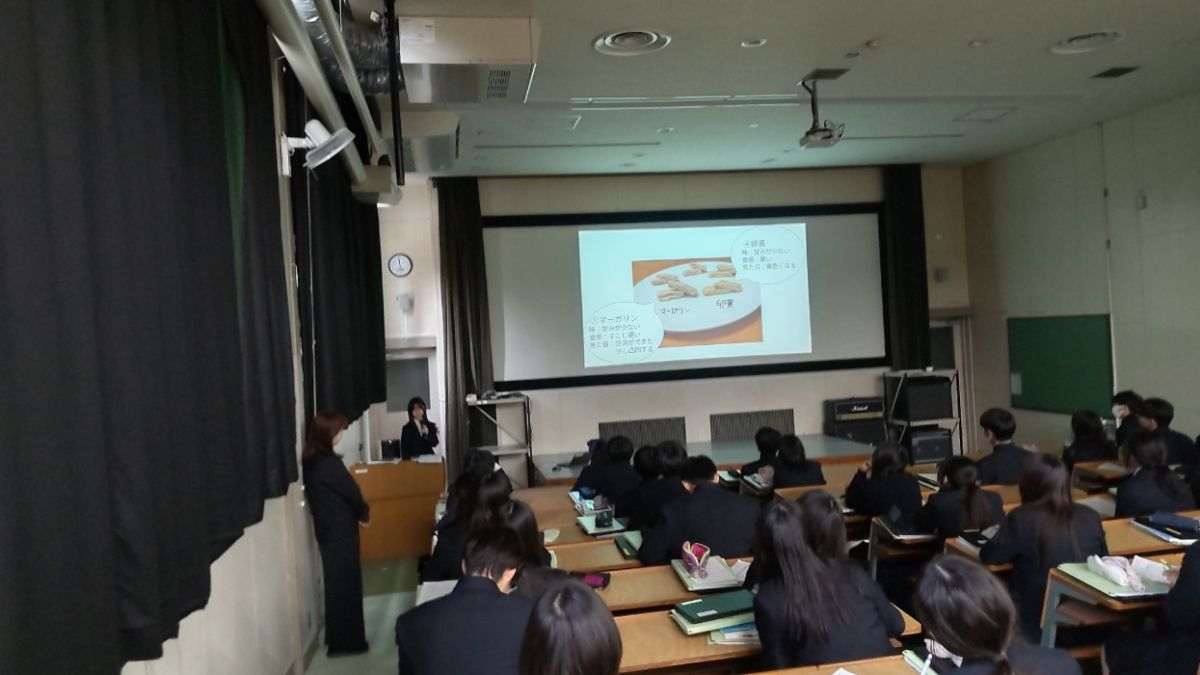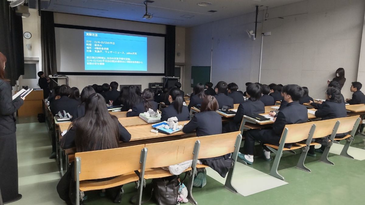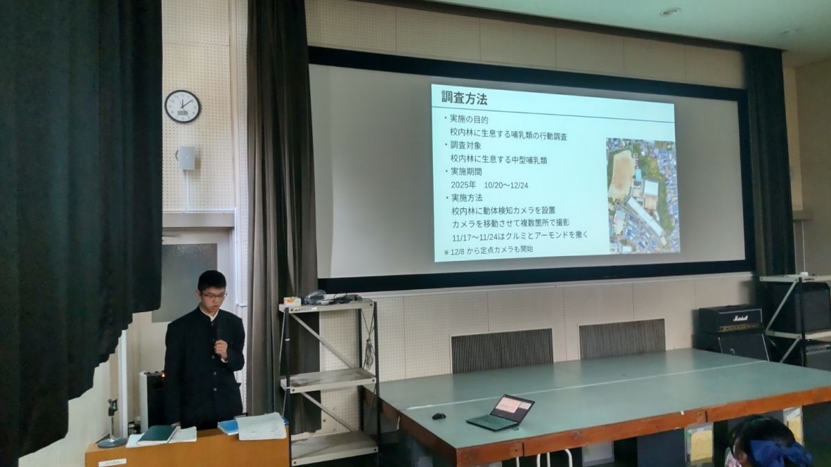 2月6日(金)4限、視聴覚教室にて、1年7組・8組・9組の「個人探究スライド代表者発表会」が実施されました。本日の発表は、「最も正確な天気予報とは」「バター不使用のクッキーを作るにはどのような材料を使えばバター使用のクッキーに1番近くなるのか」「刀根山高校の裏山に生息している中型哺乳類は天候によって行動を変えるのか」の3題ですが、どの発表もクラス代表だけあって、とても素晴らしい内容でした。聴衆が聞きやすい話し方、パワーポイントを使ってスライドを指し示すなどプレゼンテーターとしても磨きがかかっています。3人とも内容を精査し、きっちり5分で話をまとめました。お見事!生徒からの質問にもしっかり返答。担当の先生や担任の先生からもさらなるレベルアップを期待しての講評をいただきました。「私からは「1年生でここまで仕上げたのは立派。この調子でいけば、3年生でのTONR究Dayでの発表はすごいものになると思う。いっそう磨きをかけてほしい。プレゼンの際には、聞く人を見てはなす、身振り手振りも効果的。聞く人は必ず質問をする意気込みで聞いてほしい。発表会は話す人と聞く人が真剣勝負のつもりで参加すると内容が深まり、充実したものになる。」とコメントしました。話を終えると拍手をしてくれたので、これまた、感動。しっかりマナーも身につけてくれています。【お詫び】2月5日に1年1組・2組・3組の代表発表会があったのですが、会議が入ってしまい、参加ができませんでした。ごめんなさい。