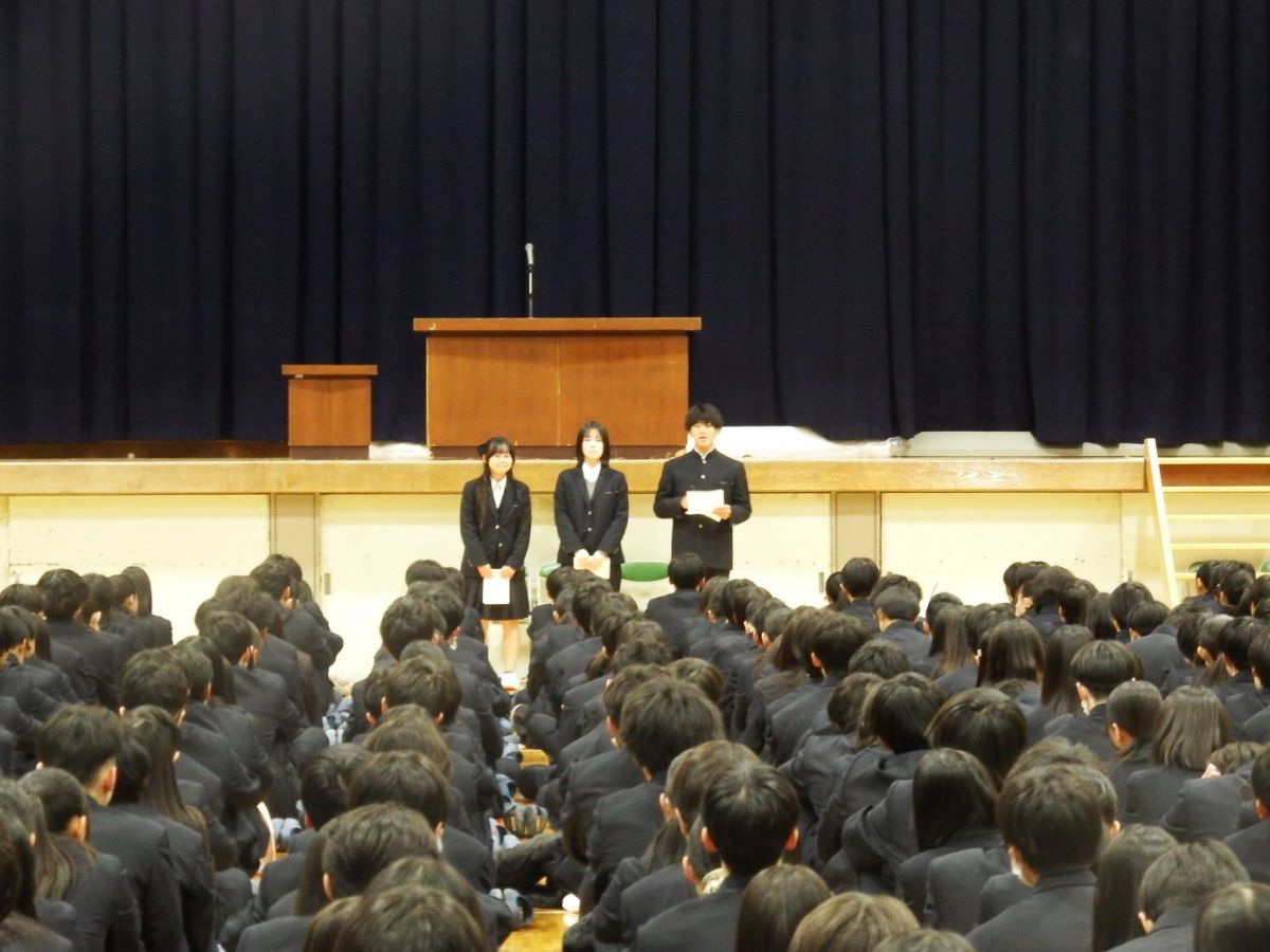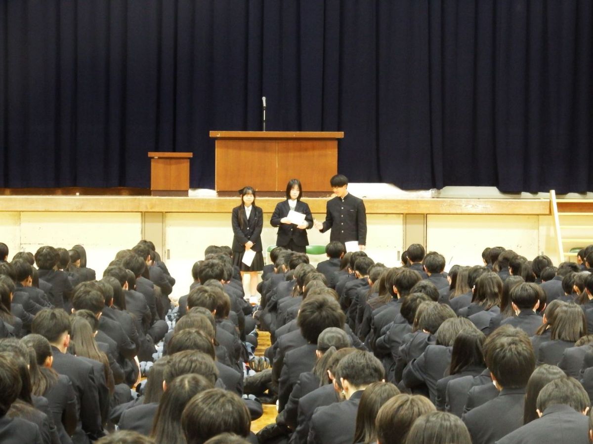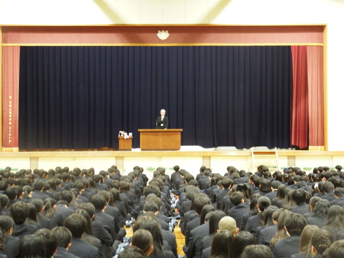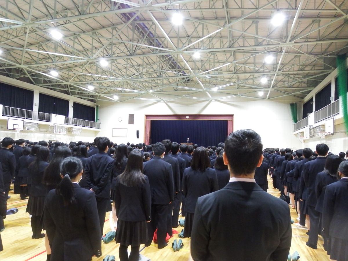 1月8日(木)8時45分より、体育館にて3学期始業式を行いました。寒さの厳しい中でも生徒たちはきっちり整列し、話もしっかり聞いてくれました。さすが刀根山生です。式辞で『3学期は大変短く、忙しい学期。3年生は大学入学共通テスト、私大入試本番を迎え「為せば成る」の心意気で頑張ってほしい。授業も1か月もない。いまやるべきことに全集中し、刀根山高校での一日一日を大切するように。2年生には「3年生0学期スタート」「受験は団体戦」、1年生には「勉強の自走化」について話しました。最後に、これまでも繰り返し伝えてきた「時を守り、場を清め、礼を正す」が「成功する人の三原則」であること。それを実践することで自己を磨き、夢を実現してほしい』と話しました。式辞の後は、部活動表彰。男子バレーボール部は公立高校大会で3位!よく頑張ってくれました。続いて、地区大会で優勝や準優勝など上位入選をした男子バスケットボール部、男女ハンドボール部、陸上部を表彰。陸上部の1年生伊佐逸輝君は高体連陸上部の強化選手に選考されました!最後に生徒会三役から「刀根山サミット」の報告。生徒会のアンケートに真摯に答えてくれたことや話をしっかり聞いてくれることへのお礼と制服変更の進捗状況や「刀根山エンジョイディ」の実現などの報告がありました。大変立派な説明、話しぶりで生徒たちからたくさんの拍手が贈られました。