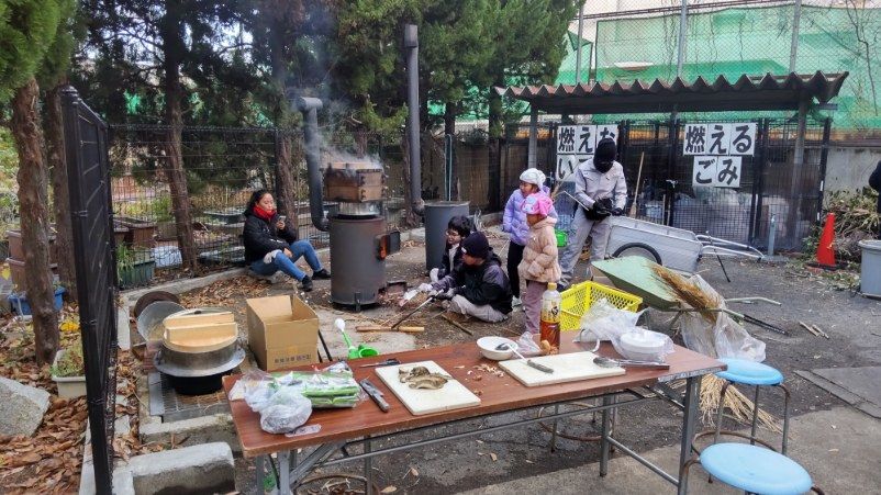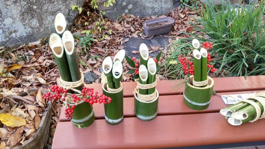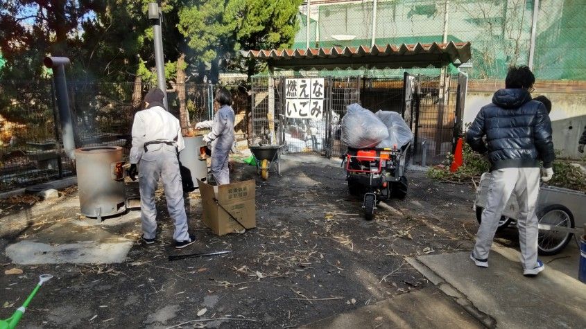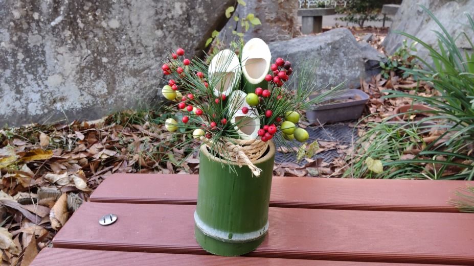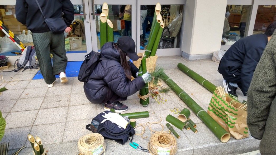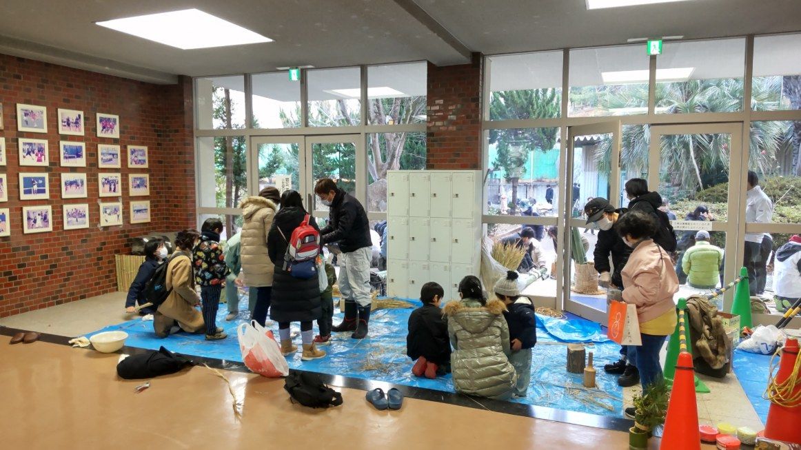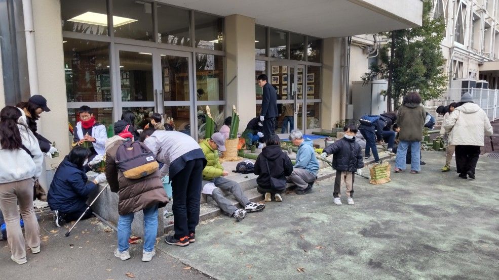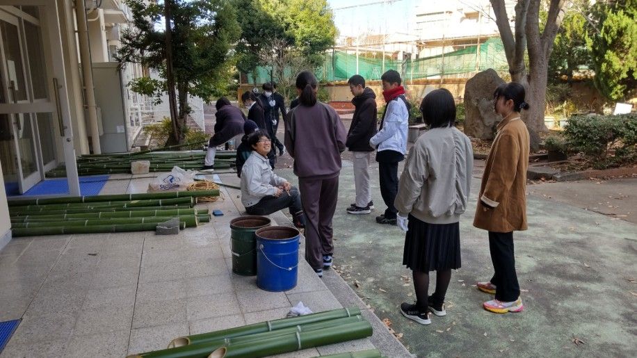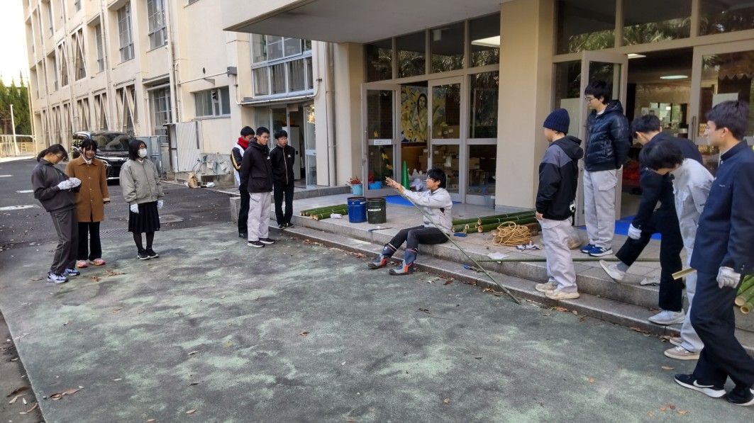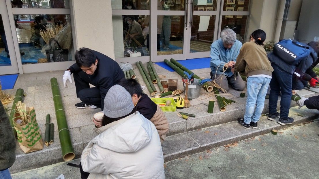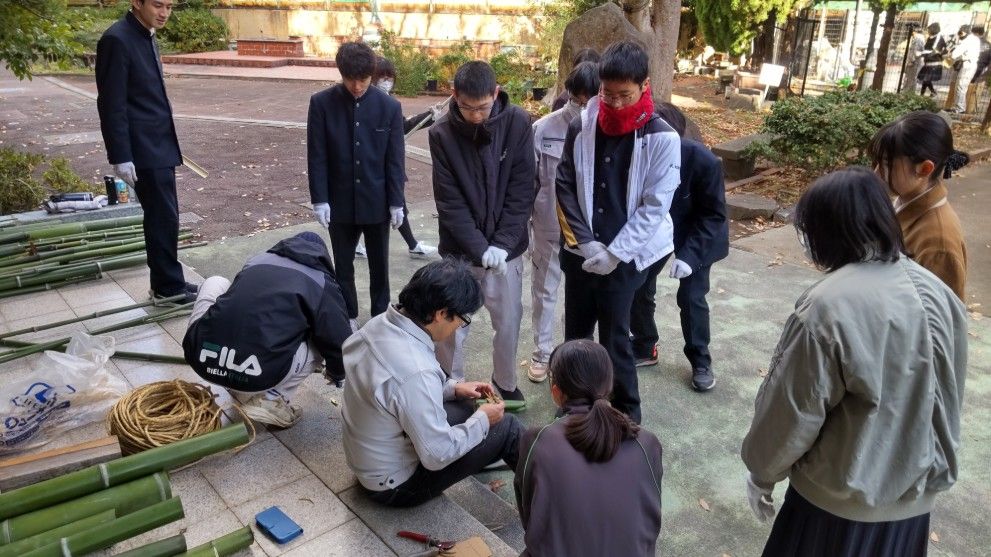 12月26日(金)14時から17時まで、蛍池公民館主催の《冬の里山を楽しむ「ミニ門松としめ縄づくり」》が本校の裏玄関前で実施されました。毎年大人気の講座で、今年も3倍を超える申し込みがあったそうです。総勢28名の参加者で、小さいお子さんから大人の方まで、本校の先生の指導のもと、ミニ門松としめ縄を作成。みなさん、門松やしめ縄を手作りできるとあって、とても真剣かつ楽しそう。アシスタントは本校生物エコ部員たち。部員は午前中から資材(素材の竹などはみな本校の里山でとれたもの)を準備したり、講座中には振る舞い用の芋をふかしたりするなど、大忙しの大活躍でした。