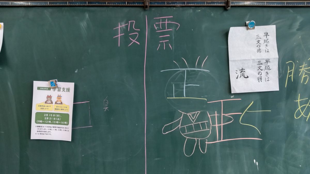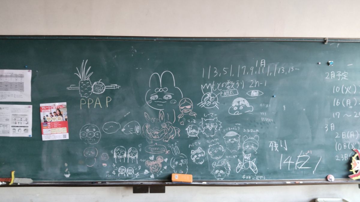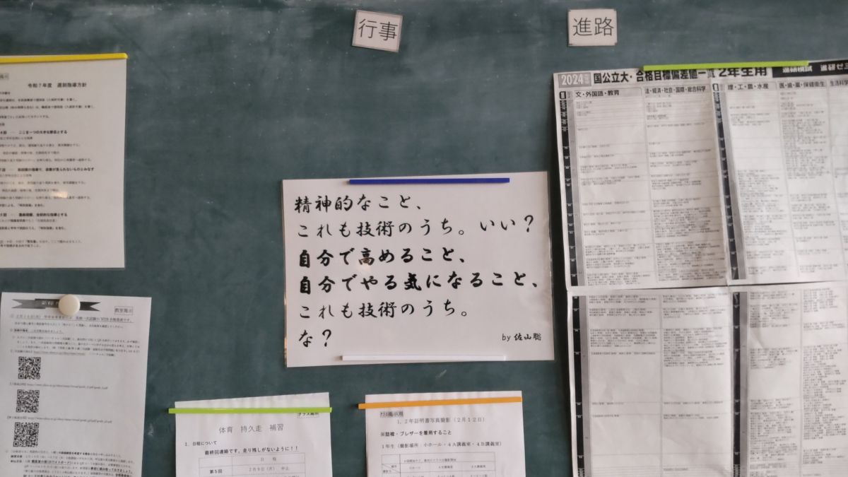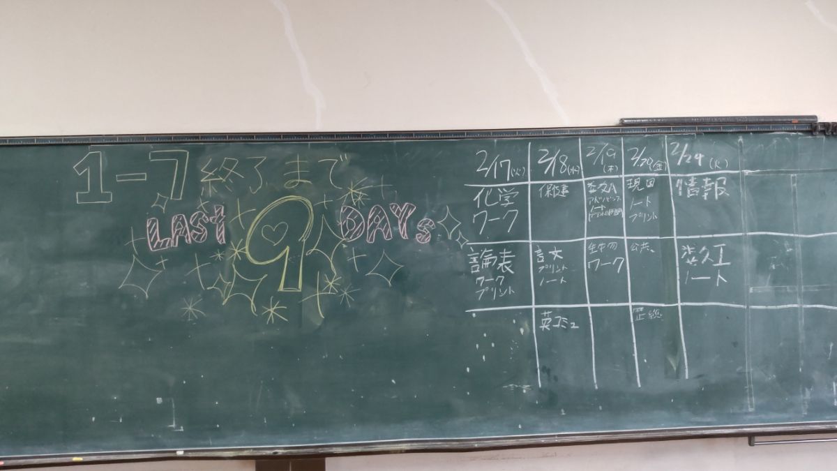 2年生の教室の後ろ黒板にカウントダウンが書かれていました。授業も来週月曜の16日まで。17日からは学年末考査です。