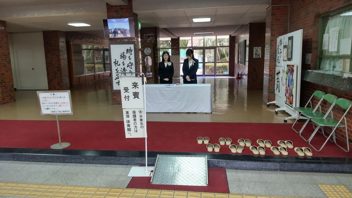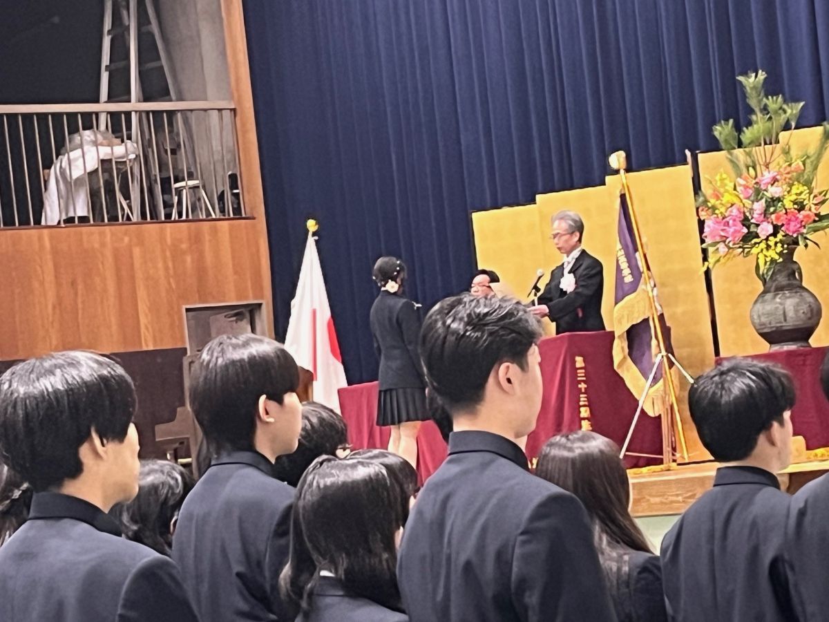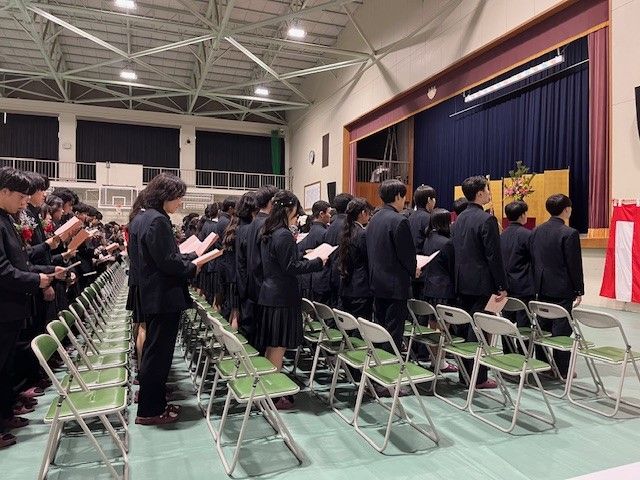 2月27日(金)10時より、体育館にて、第47回卒業証書授与式を挙行しました。雨も降ることなく、寒さも緩み、式には大変良い天候となりました。卒業証書授与では、全生徒が呼名にしっかり返答。立ち姿も立派。卒業生代表の所作も美しく、見事でした。式辞では「時を守り、場を清め、礼を正す」について話させていただきました。『非常に簡単なことだが、これをきっちりやれば、必ず成功する。「人生で成功する人の三原則」。卒業生のみなさんには是非覚えて、実践してほしい。「為せば成る 為さねばならぬ 何事も 成らぬは人の 為さぬなりけり」の心意気を忘れず、前途洋々の未来に向けて歩み続けて』とエールを贈りました。PTA会長からの心温まるご祝辞のあと、生徒会長の送辞、3年生代表による答辞と続きましたが、どれも素晴らしい内容で、ご来賓のみなさまから大変なお褒めの言葉をいただきました。特に答辞では、保護者のみなさまへの感謝の言葉を心を込めて話してくれましたので、多数の方が涙腺崩壊したと思います。卒業の歌はみなが心を込めて大きな声を出し歌ってくれたので、これもまた感激。胸が熱くなりました。さすが47期生。「トライアンドエラーアンドトライ」を学年スローガンにしてきただけあって、最後の行事も見事に仕上げました。