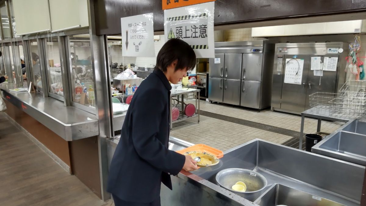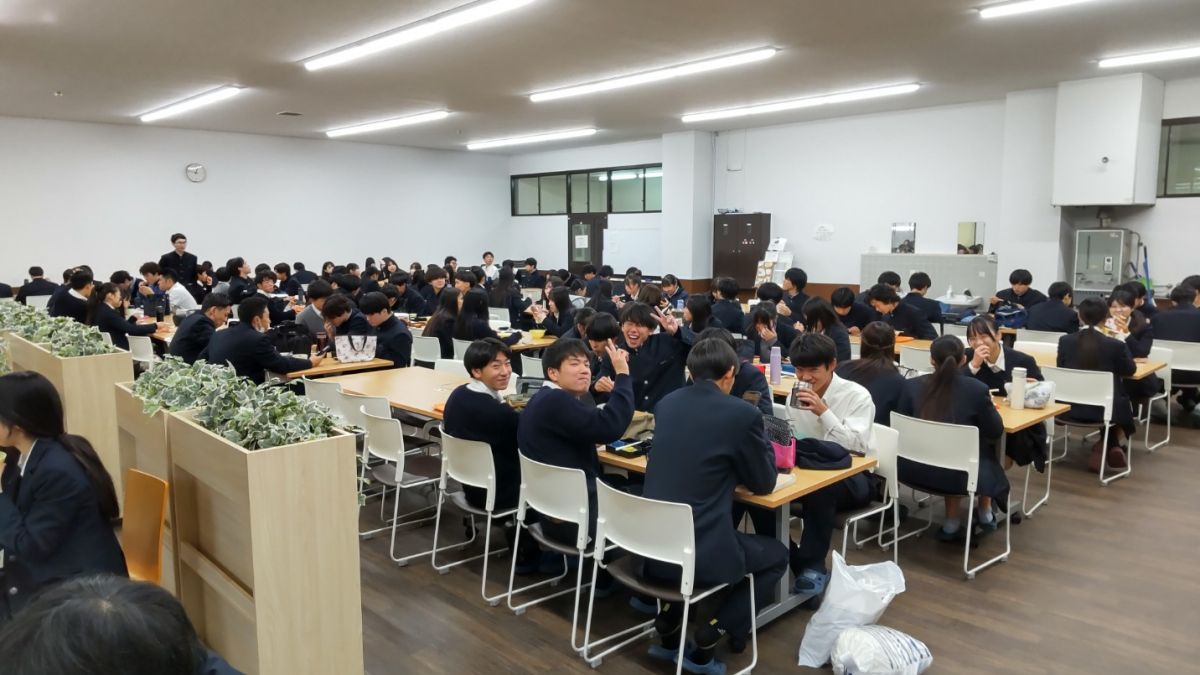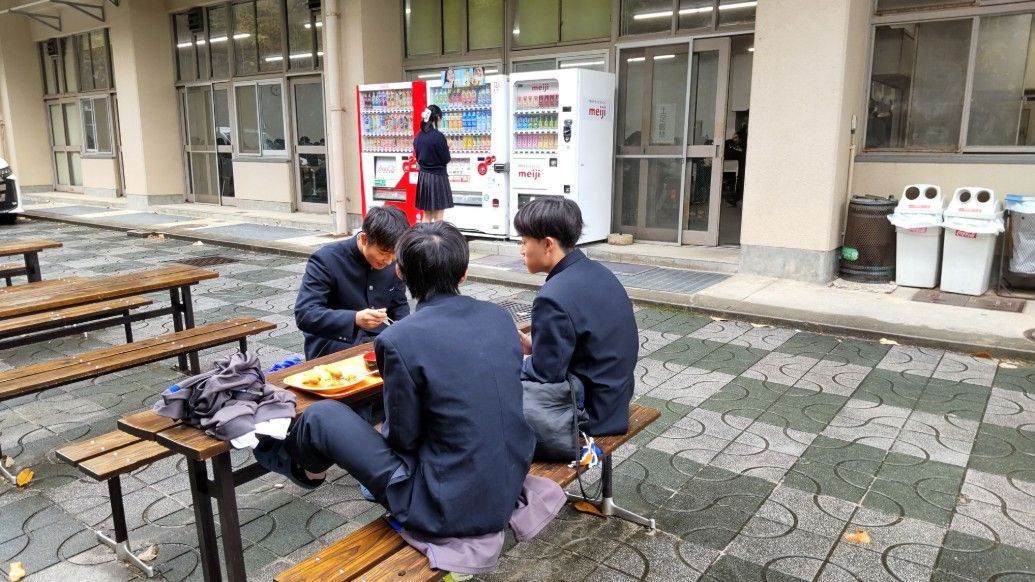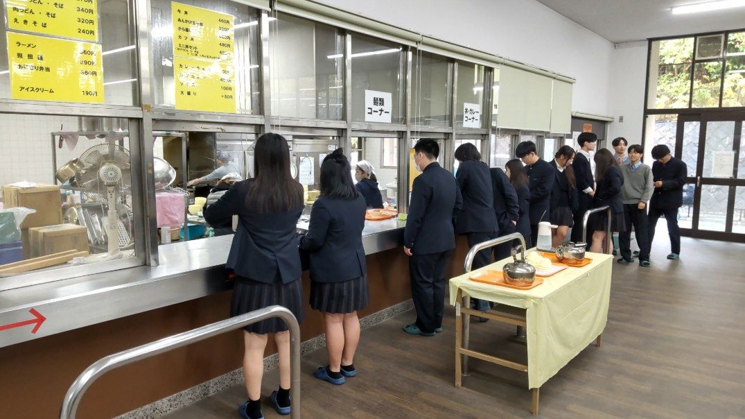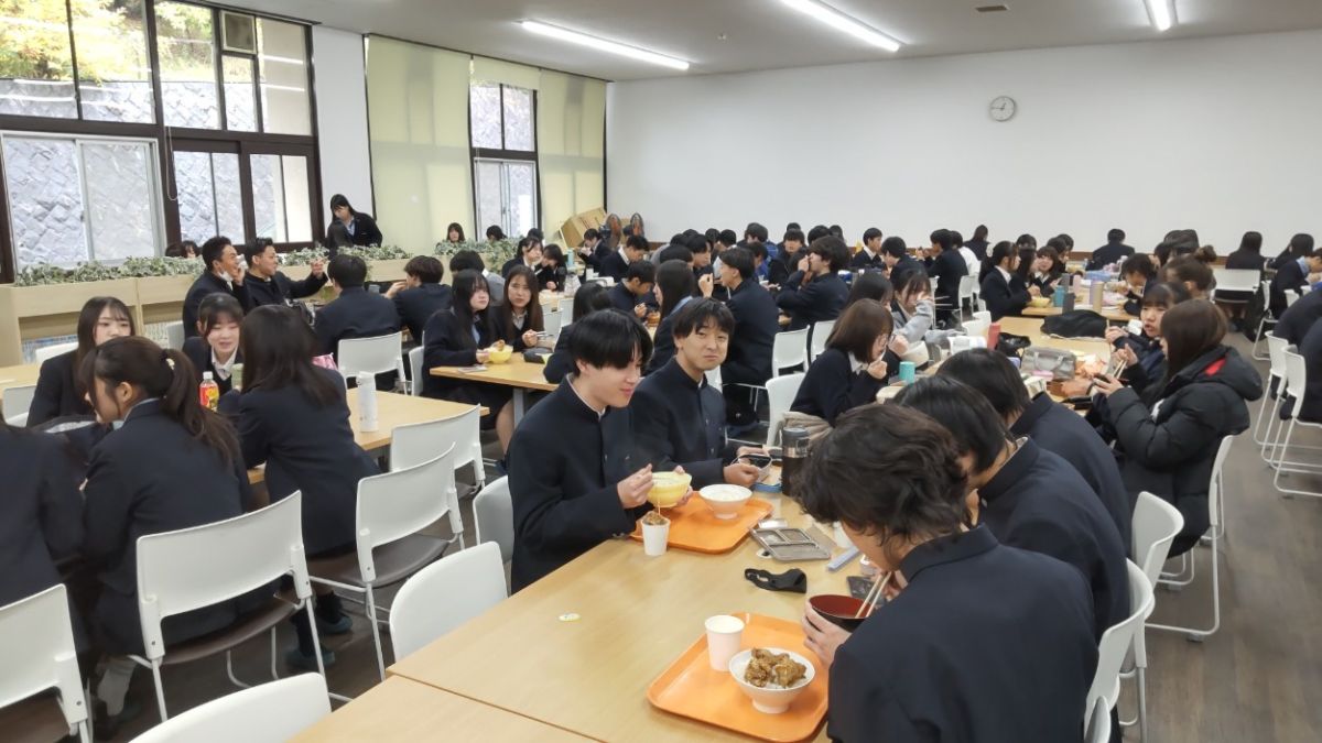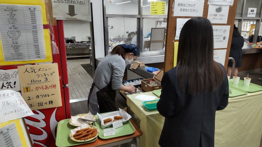 食堂の掲示板にメッセージが。「3年生の皆様へ 残り少な学校生活、最後に食堂の味を覚えていってみませんか?お待ちしております」3年生たちは今、受験勉強に全集中で頑張っていますが、本校で過ごす時間を大切に、たくさんの思い出も作ってほしいと思います。昼休み、食堂で食事をして気分転換。卒業後、「受験で必死だったあの時食べた唐揚げ、うまかったなぁ」と刀根山での思い出がリアルによみがえりますよ。11月25日(火)、今日も食堂にはたくさんの生徒が詰めかけていました。雨上がりでしたが、いつもテラスで食べるという3人組は今日もテラスでランチ。「おすすめはカツカレー!この時期は豚汁もいいです!」と教えてくれました。
