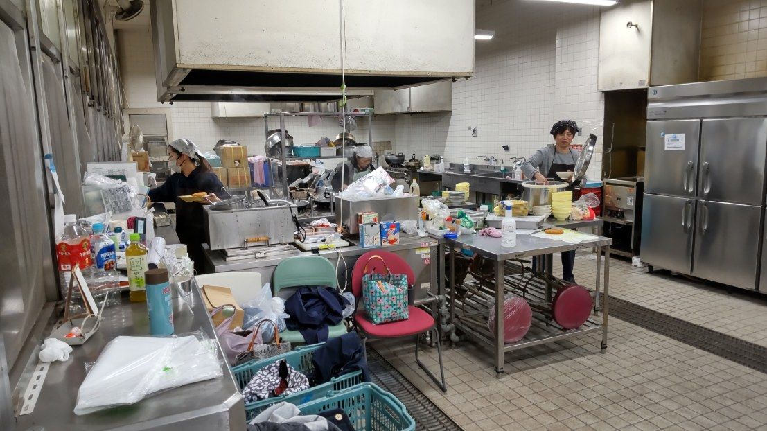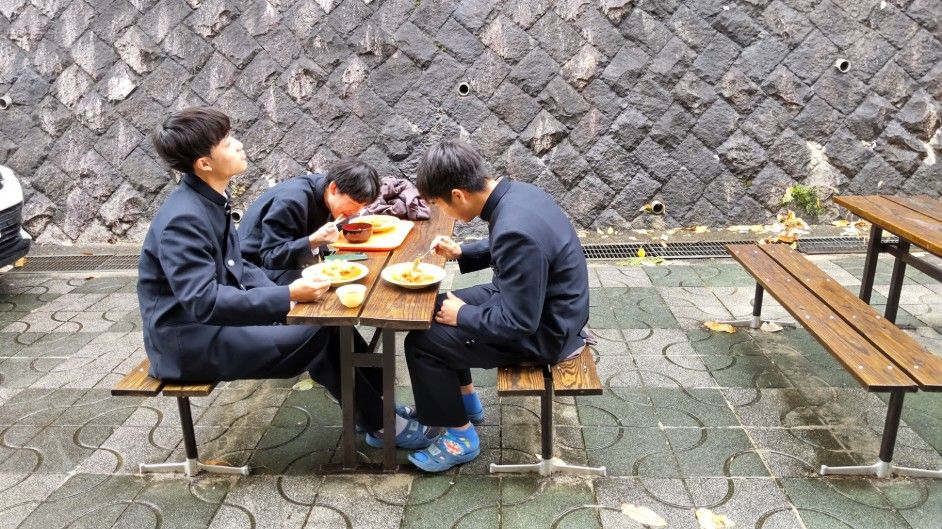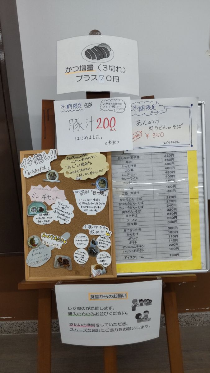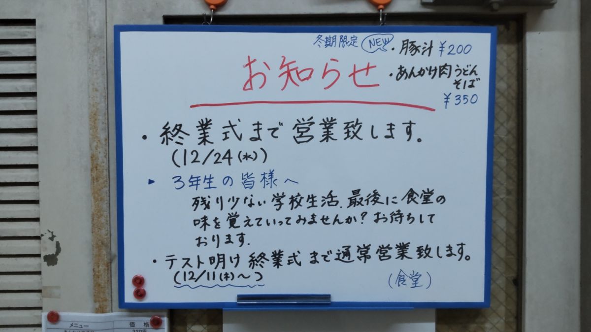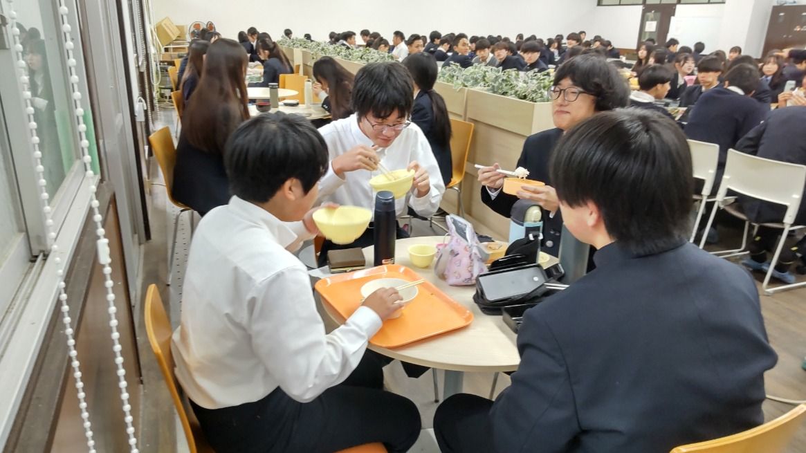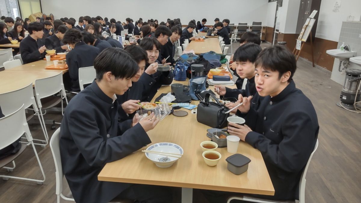 食堂の掲示板にメッセージが。「3年生の皆様へ 残り少な学校生活、最後に食堂の味を覚えていってみませんか?お待ちしております」3年生たちは今、受験勉強に全集中で頑張っていますが、本校で過ごす時間を大切に、たくさんの思い出も作ってほしいと思います。昼休み、食堂で食事をして気分転換。卒業後、「受験で必死だったあの時食べた唐揚げ、うまかったなぁ」と刀根山での思い出がリアルによみがえりますよ。11月25日(火)、今日も食堂にはたくさんの生徒が詰めかけていました。雨上がりでしたが、いつもテラスで食べるという3人組は今日もテラスでランチ。「おすすめはカツカレー!この時期は豚汁もいいです!」と教えてくれました。