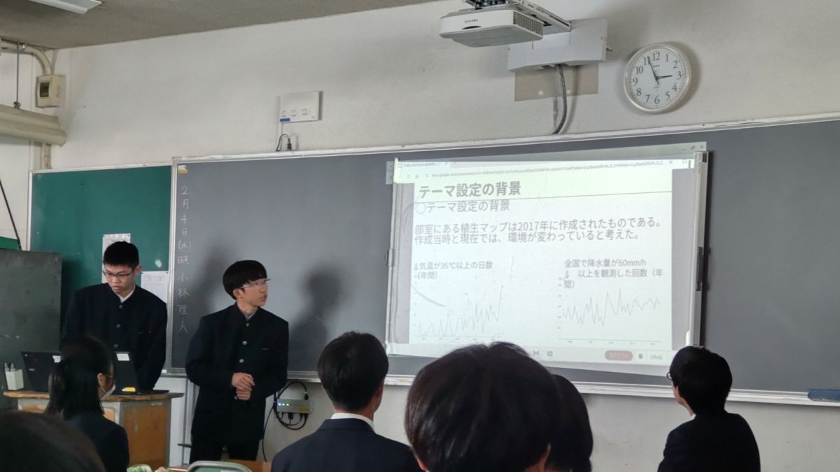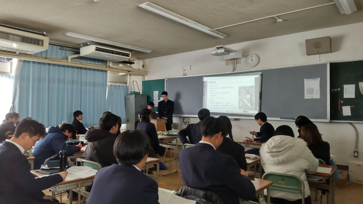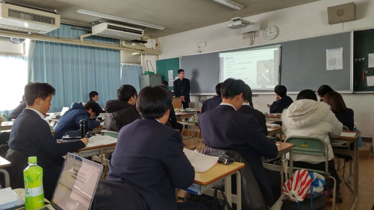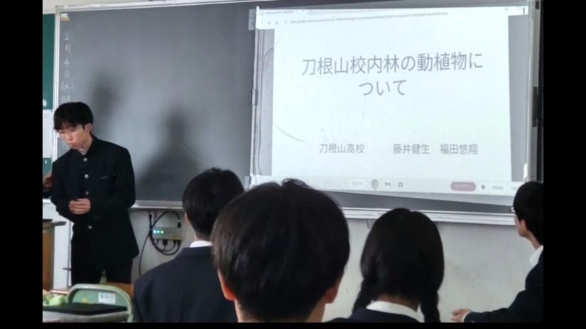 2月5日(木)豊中高校にて「課題研究発表会」があり、本校生徒6名が豊中高校の生徒の前で研究発表をしてきました。この「課題研究発表会」はこれまでは豊中高校の生徒たちだけでやっていたそうですが、『今年度は、各校における「総合的な探究の時間」の発展と生徒の意欲向上を目的として、近隣の府立学校の生徒の皆様の研究成果を募集し、生徒間の発表交流の場を設ける』こととして実施。本校も参加のお声がけをいただきましたので、生徒6名が3つのテーマ(「刀根山高校生徒が校内林に持つ印象:植物多様性と比較して」「刀根山校内林の動植物について」「ゲンジボタル幼虫の代替餌の検討」)で研究発表を行いました。豊中高校のみなさんの発表はどれもレベルが高く、話し方も聴衆を意識して大変上手。感動しました。本校生たちも豊中高校の生徒に負けじと気合を入れて発表。私が参観させていただいた教室では、本校生の発表が終わると豊中高校の生徒さんが6回くらい質問してくれました。豊中高校の生徒さんの発表時より多くの質問があり、本校生も嬉しかったと思います。本校も「TONE究」で同様の取組みをしていますが、他校の生徒と切磋琢磨できる機会があるのは大変有難いです。次年度も是非参加させていただきたいと思っています。