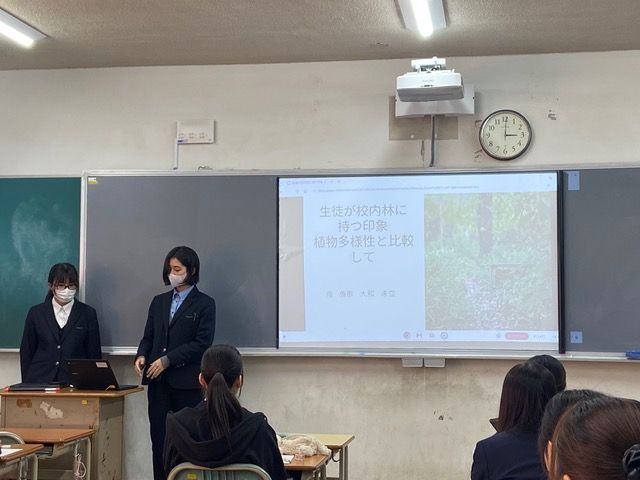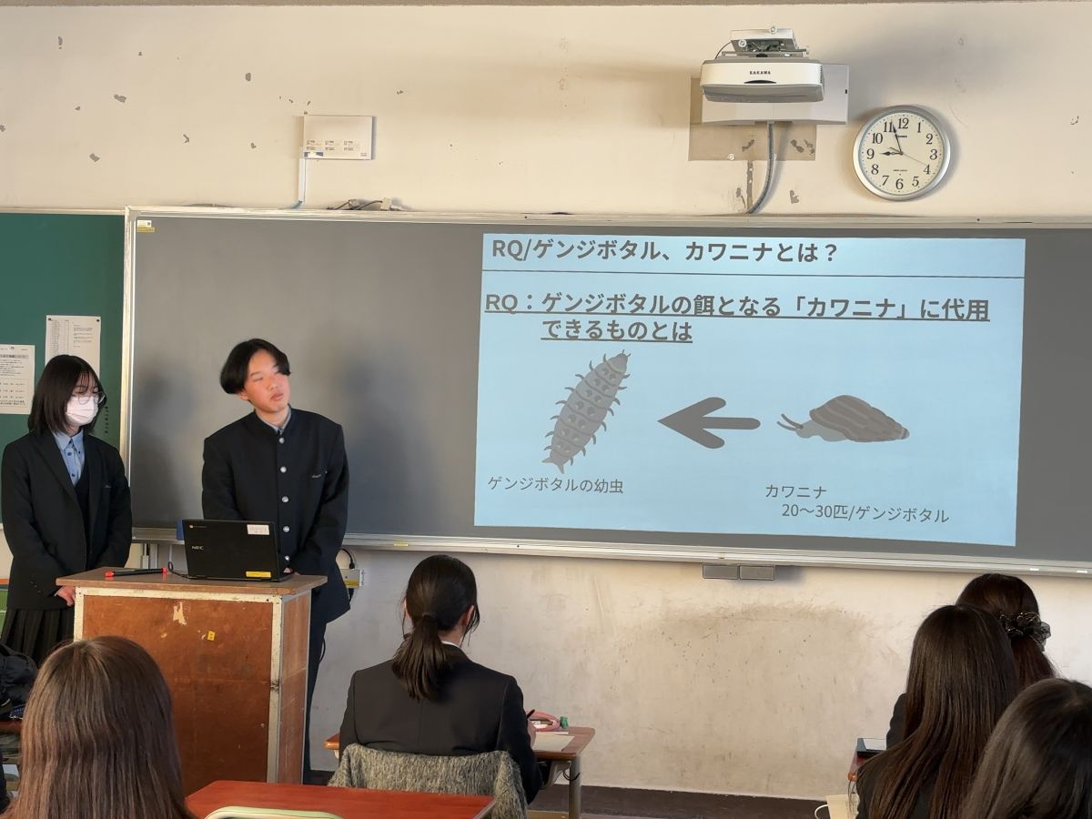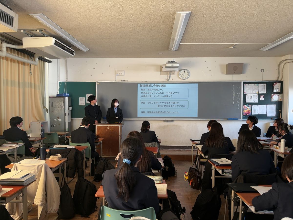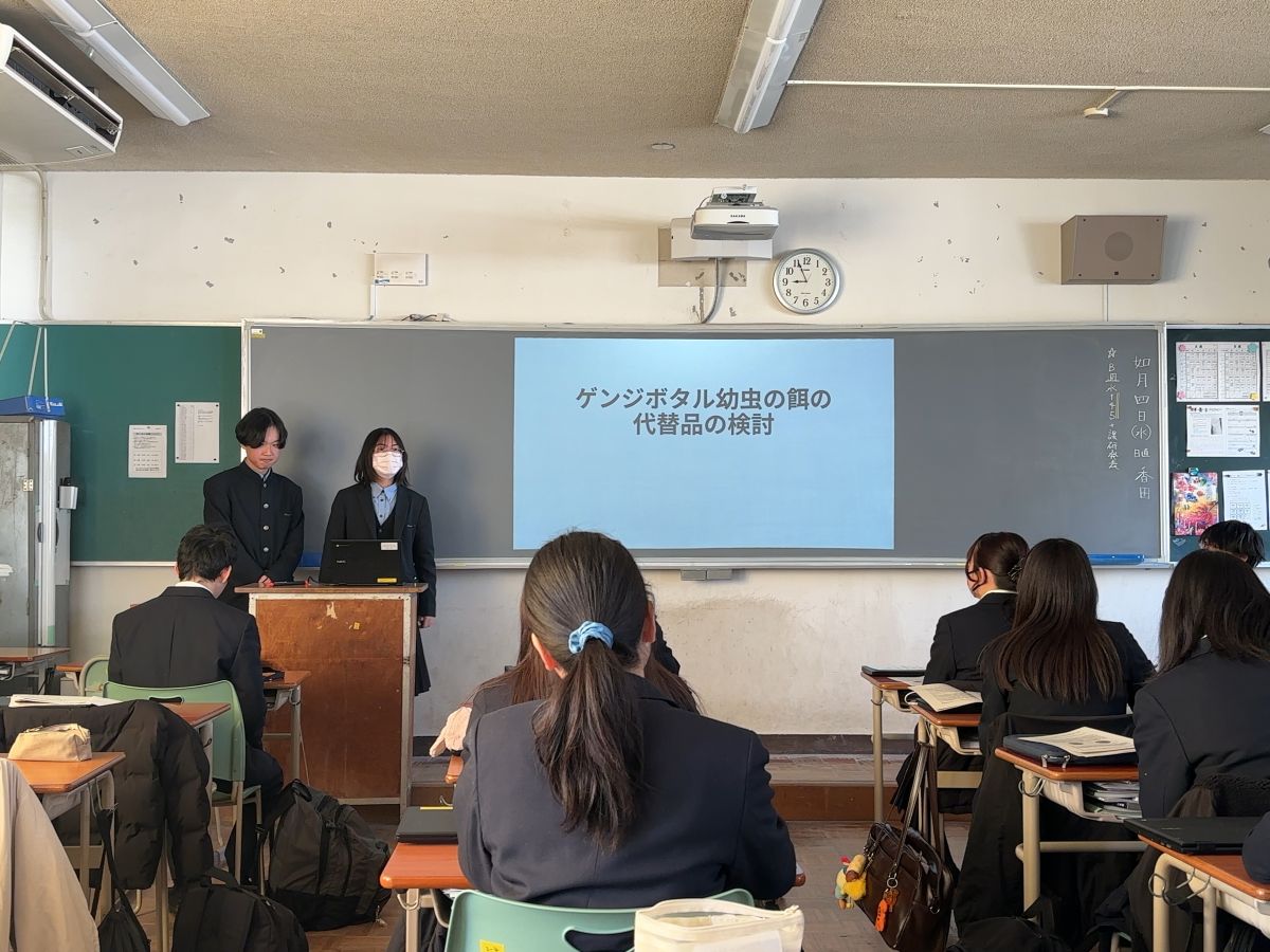2月5日(木)豊中高校にて「課題研究発表会」があり、本校生徒6名が豊中高校の生徒の前で研究発表をしてきました。この「課題研究発表会」はこれまでは豊中高校の生徒たちだけでやっていたそうですが、『今年度は、各校における「総合的な探究の時間」の発展と生徒の意欲向上を目的として、近隣の府立学校の生徒の皆様の研究成果を募集し、生徒間の発表交流の場を設ける』こととして実施。本校も参加のお声がけをいただきましたので、生徒6名が3つのテーマ(「刀根山高校生徒が校内林に持つ印象:植物多様性と比較して」「刀根山校内林の動植物について」「ゲンジボタル幼虫の代替餌の検討」)で研究発表を行いました。豊中高校のみなさんの発表はどれもレベルが高く、話し方も聴衆を意識して大変上手。感動しました。本校生たちも豊中高校の生徒に負けじと気合を入れて発表。私が参観させていただいた教室では、本校生の発表が終わると豊中高校の生徒さんが6回くらい質問してくれました。豊中高校の生徒さんの発表時より多くの質問があり、本校生も嬉しかったと思います。本校も「TONE究」で同様の取組みをしていますが、他校の生徒と切磋琢磨できる機会があるのは大変有難いです。次年度も是非参加させていただきたいと思っています。