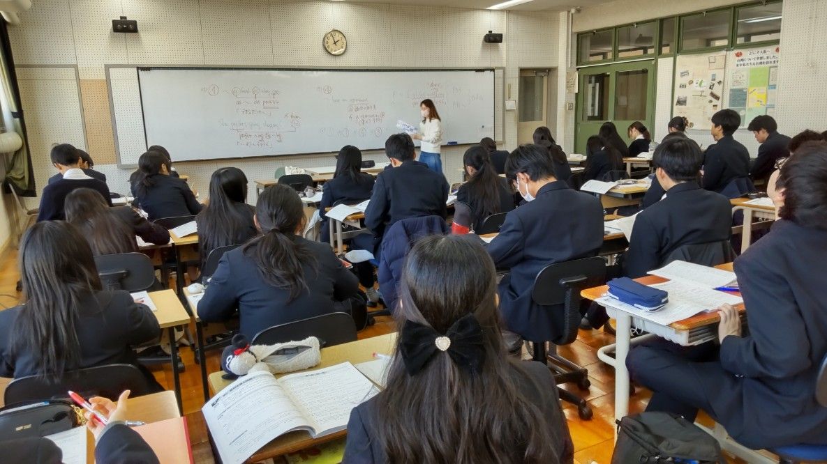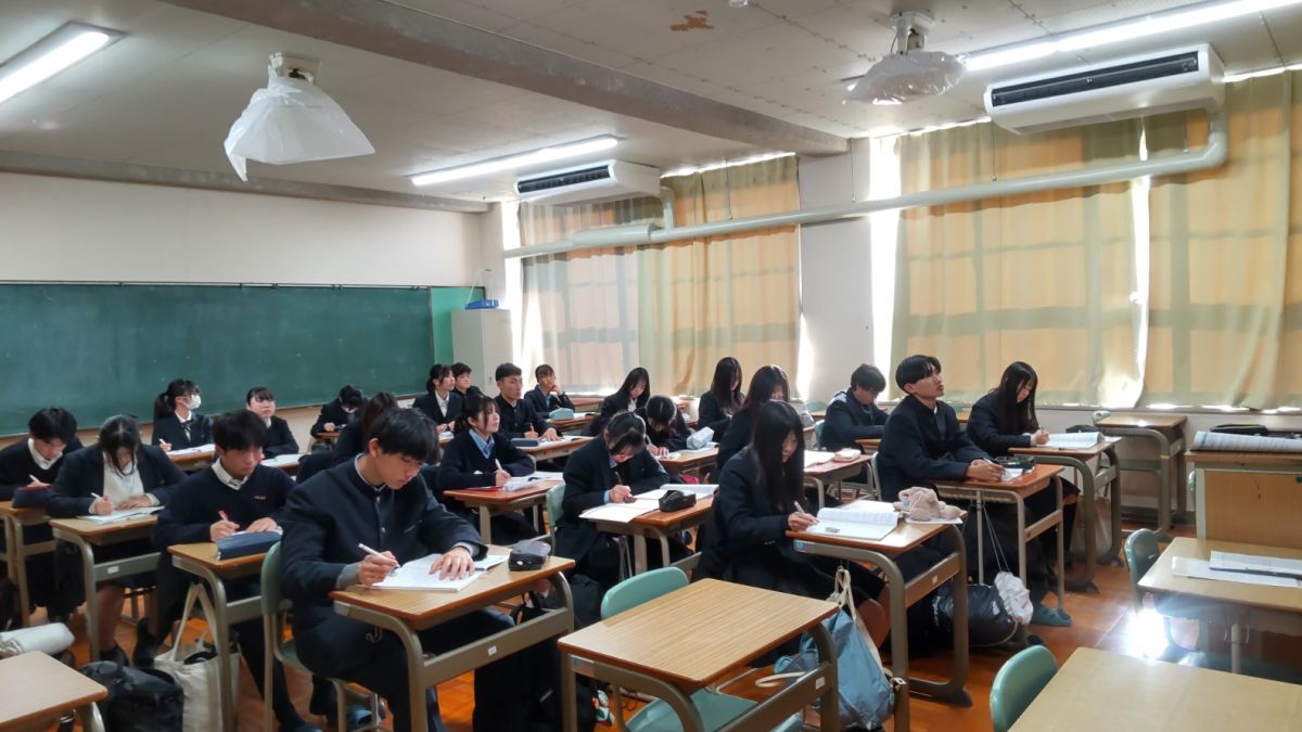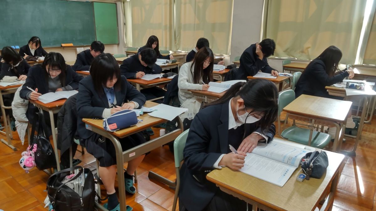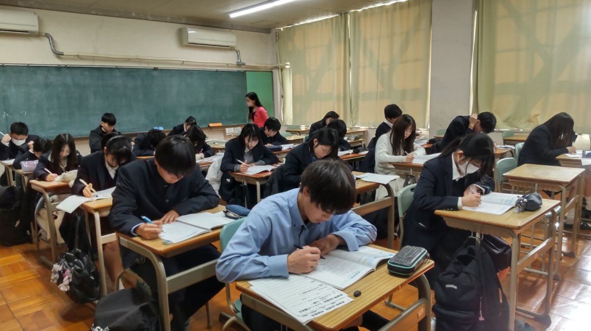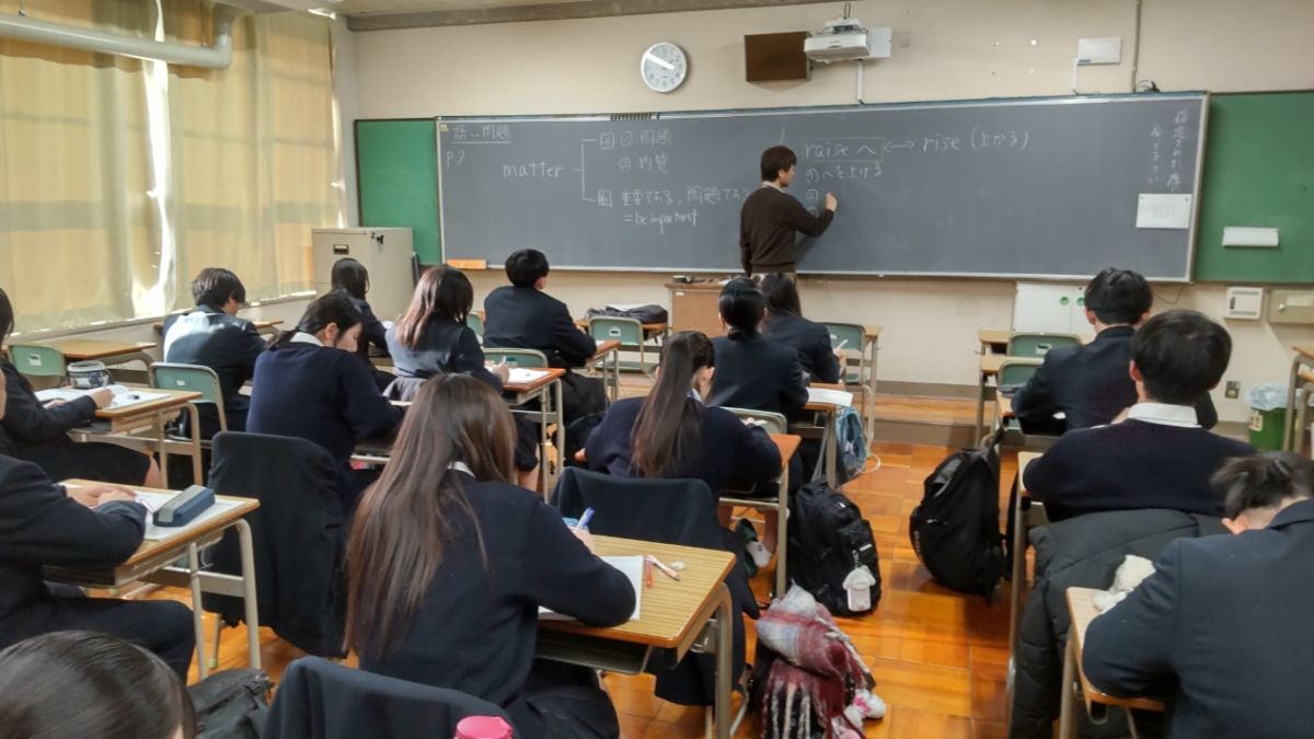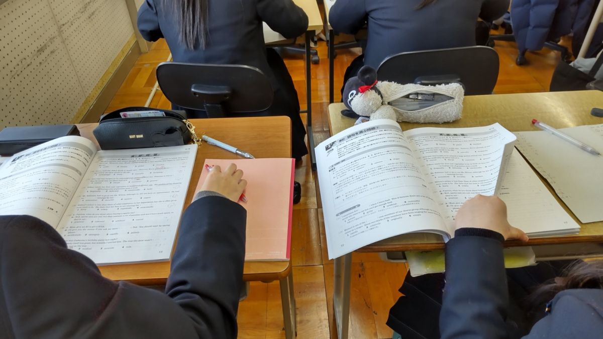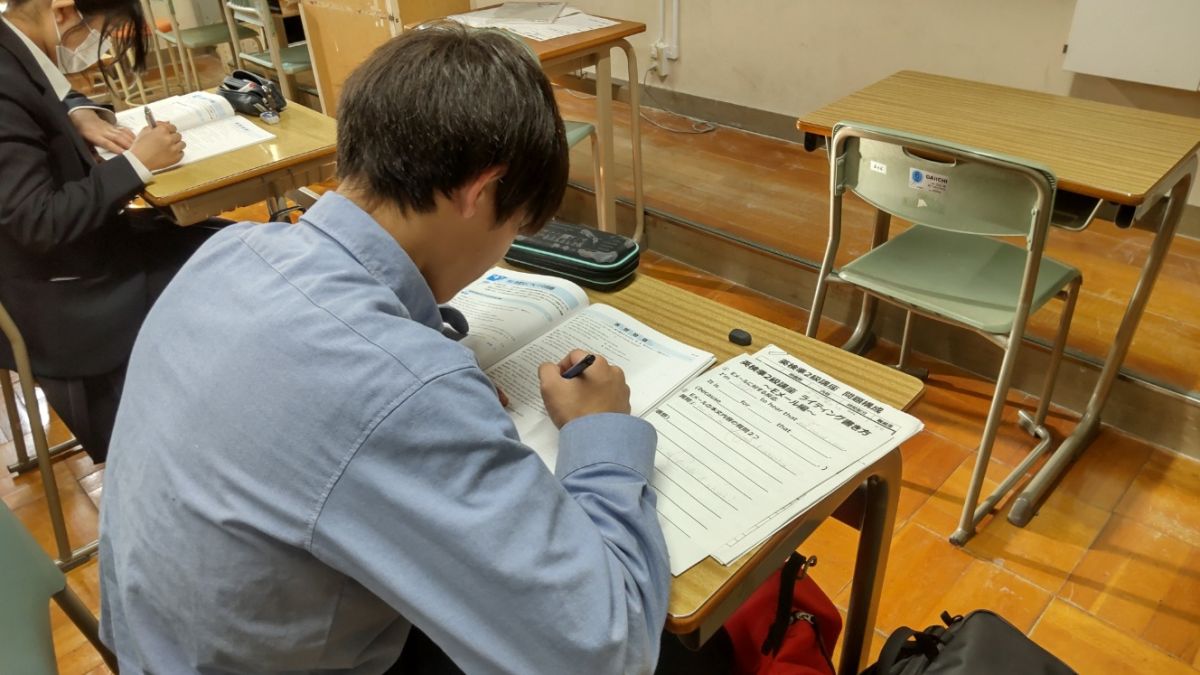 本校は「英検は全員受験」で、卒業までに2級・準2級獲得を目標にしています。学校が会場ですので、受験しやすいのと受験料の割引適用が受けられ、刀根山生はお得です!英検合格をめざして、12月17日(水)から1月8日(木)までの指定日に、2級1講座、準2級2講座を開催。各講座、計5回の講習が行われます。12月19日(金)はLL教室、3A・3B講義室で外部講師による講義が行われていました。英検合格のポイントを押さえた指導が受けられるので、生徒は真剣な表情で集中して取り組んでいました。