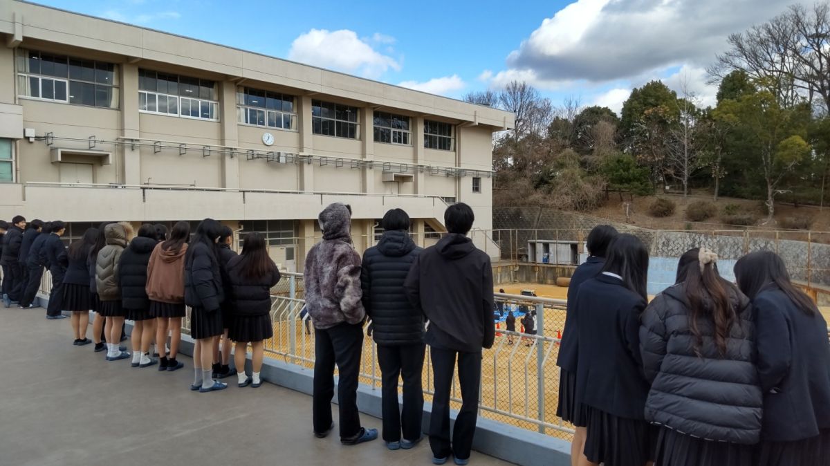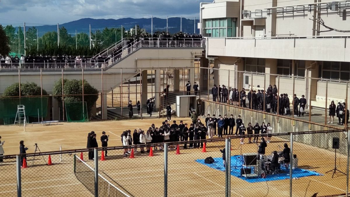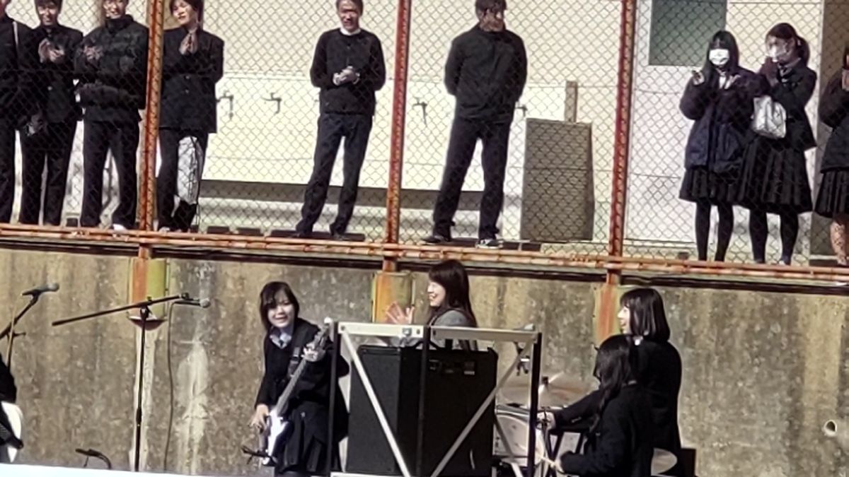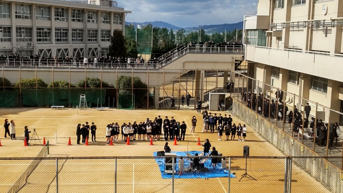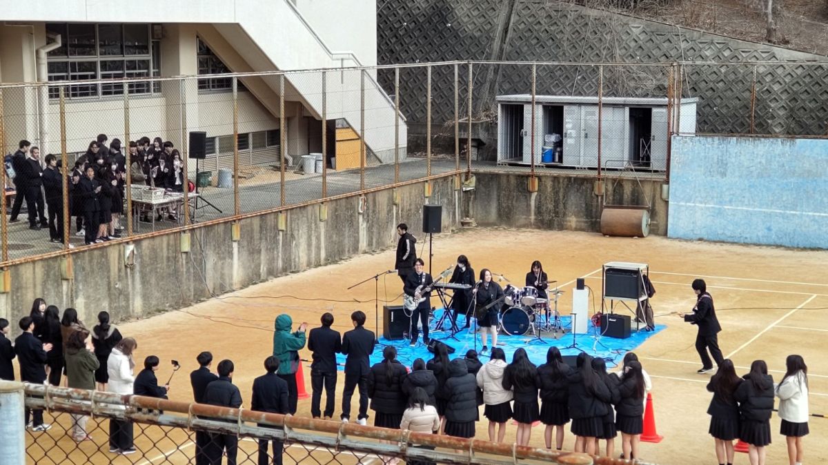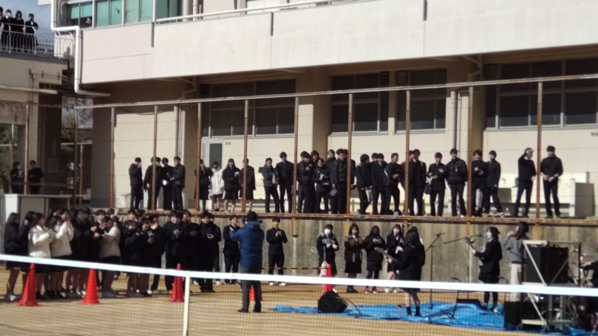 1月21日(水)12時25分から12時55分まで、テニスコートで軽音部のライブが開催されました。朝から大変冷える日でしたが、ライブの時間には多数の生徒がテニスコートや渡り廊下に集まり、演奏に聴き入りました。寒さも吹き飛ばすバンドの熱演にたくさんの拍手が贈られましたが、ライブの最後の曲で2年生担任の先生お二人がサプライズ出演!息の合った振り付けを披露され、会場は大いに盛り上がりました。2年生の担任の先生方は修学旅行でもサプライズダンスを披露されるなど、生徒の喜ぶことを気軽にしてくださるので本当に有難いです!23日(金)の昼休みにはダンス部と音楽選択生のステージが体育館で開催されます。