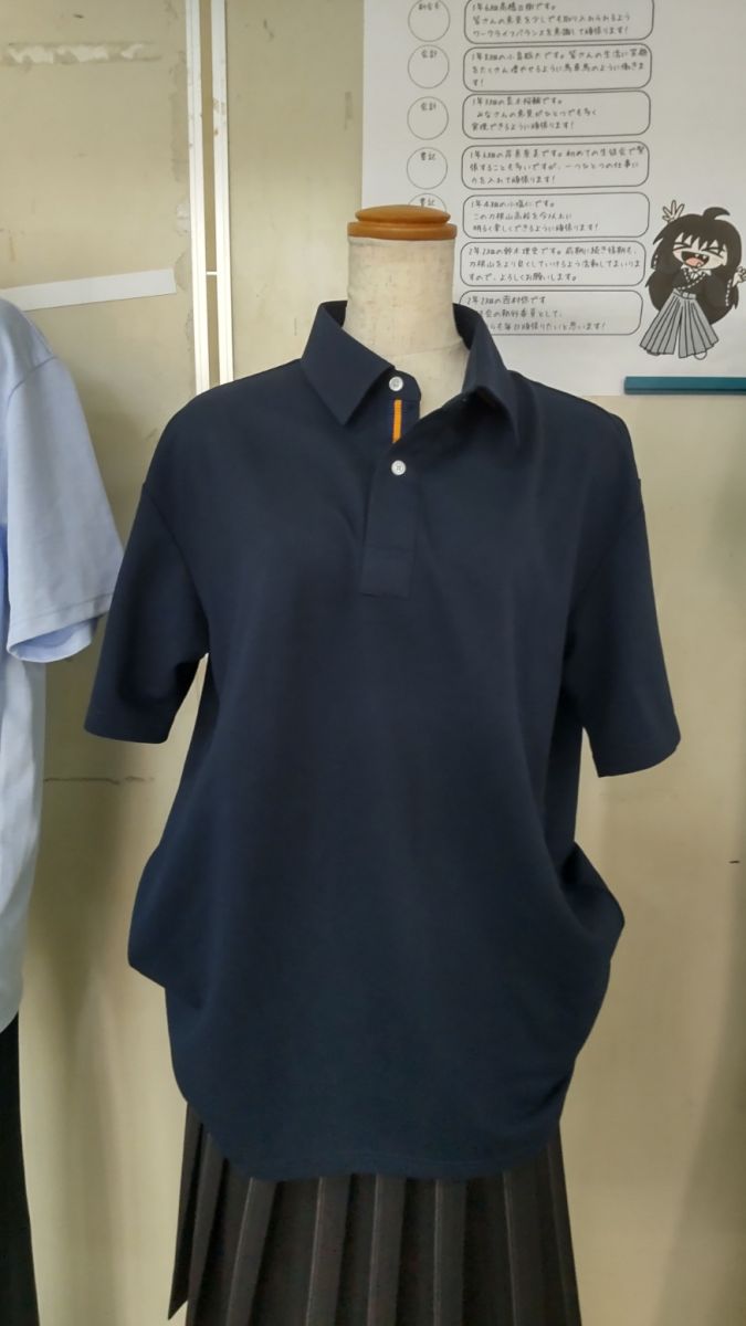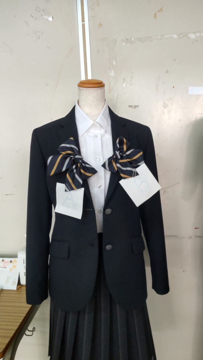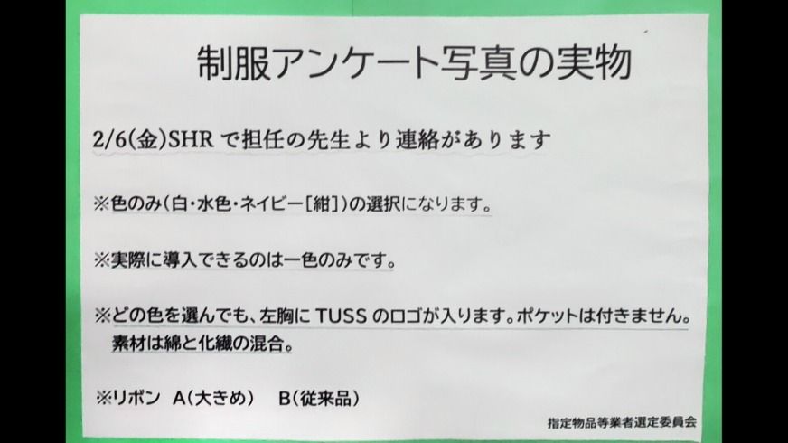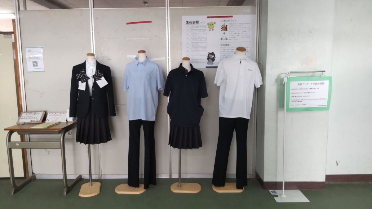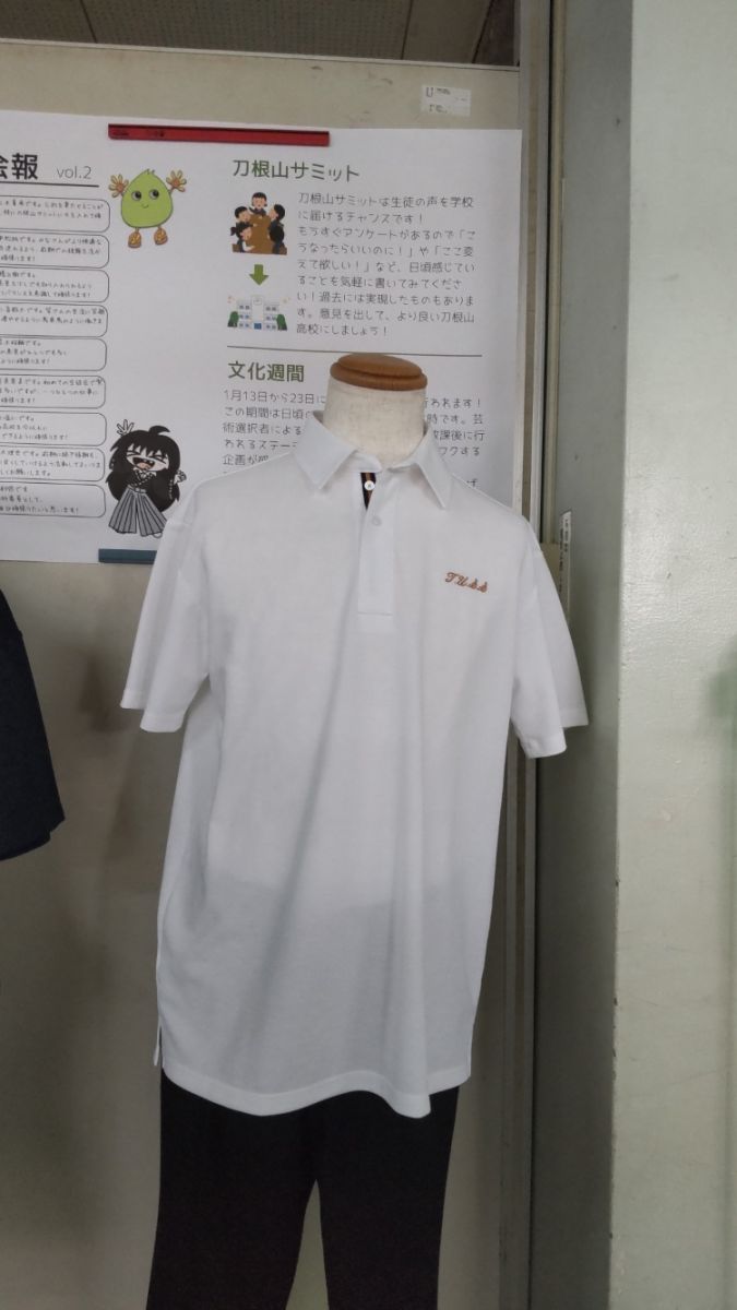 昨年度の「刀根山サミット」で要望があった「夏の制服にポロシャツを導入」が承認されました。従来のカッターシャツもそのままありますので、オプションとしてポロシャツを選ぶことができるというものです。ポロシャツについては制作の都合上、色は1色になるので、今回、どの色がよいか、徒にアンケートを取ることとなりました。色は「白・水色・紺」の3色。それぞれの見本を下足所前に展示しています。また、今年の「刀根山サミット」で要望のあった「リボンの大きさ変更と男子のブレザー導入」について、これは導入が決まったものではありませんが、生徒全体の意識を知りたいということでアンケートを取ることになりました。