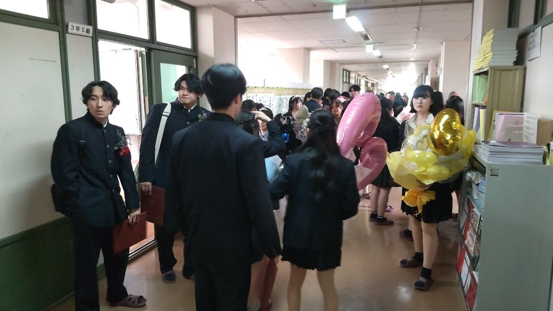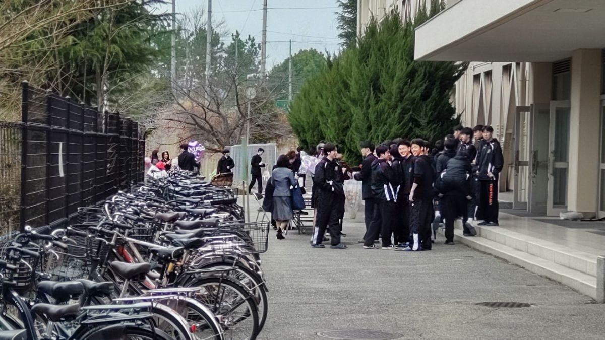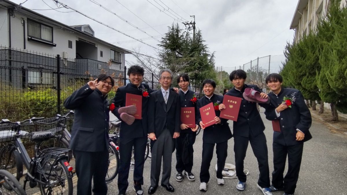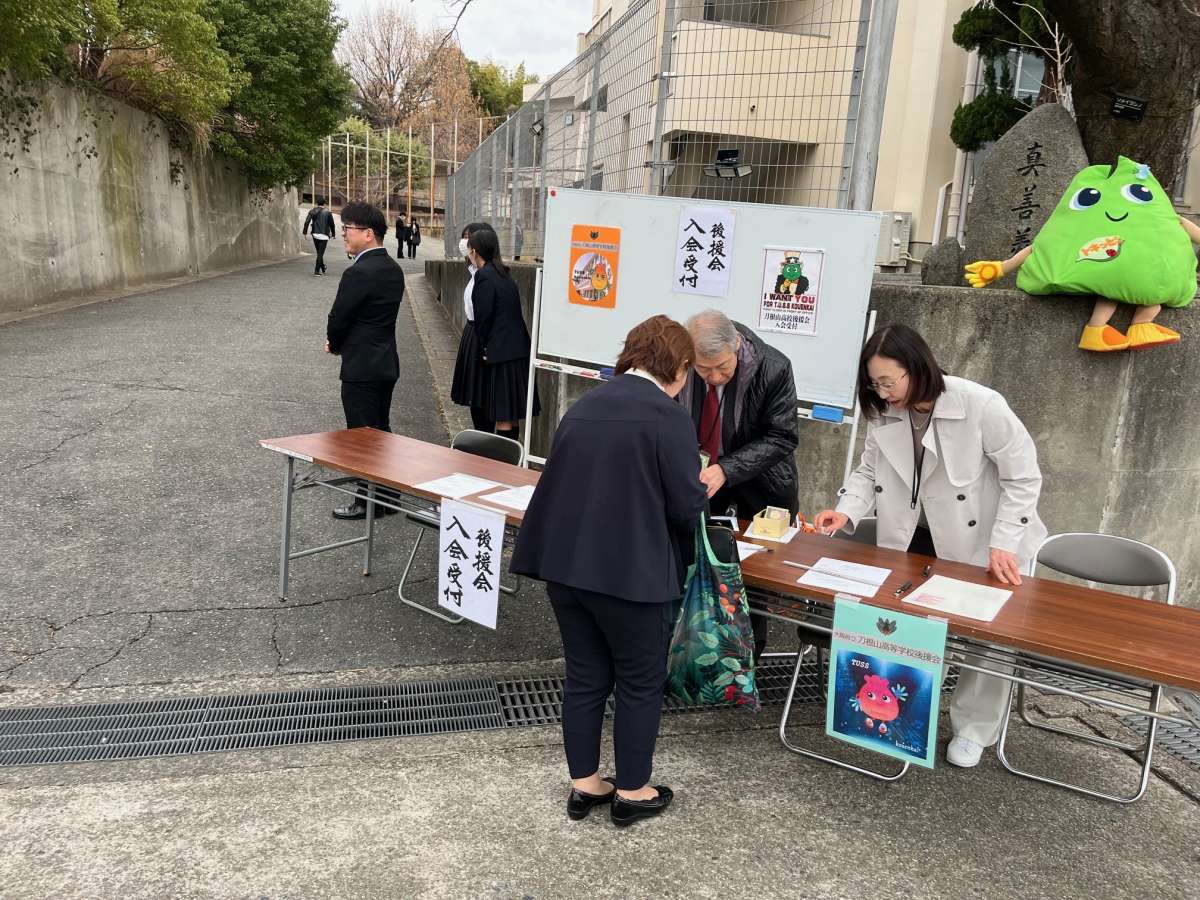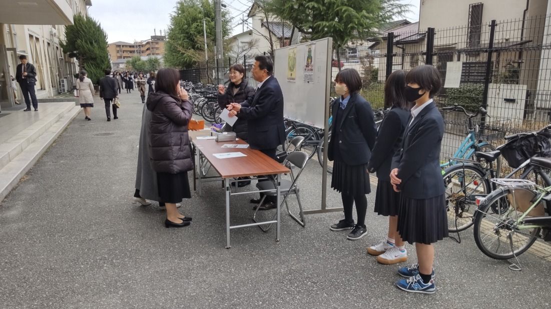 式の後、校内では記念の品を渡したり、写真を撮ったりで大変賑やかでした。式中は厳粛、式後は思いっきり楽しむ。公私の区別、メリハリをしっかりつけられる刀根山生の本当に良いところです。私も写真に入れてもらうことができました!下足所前や正門前の坂で、後援会のみなさんが入会案内をされていました。本日も多数の方が入会してくださり、本当に有難いことです。