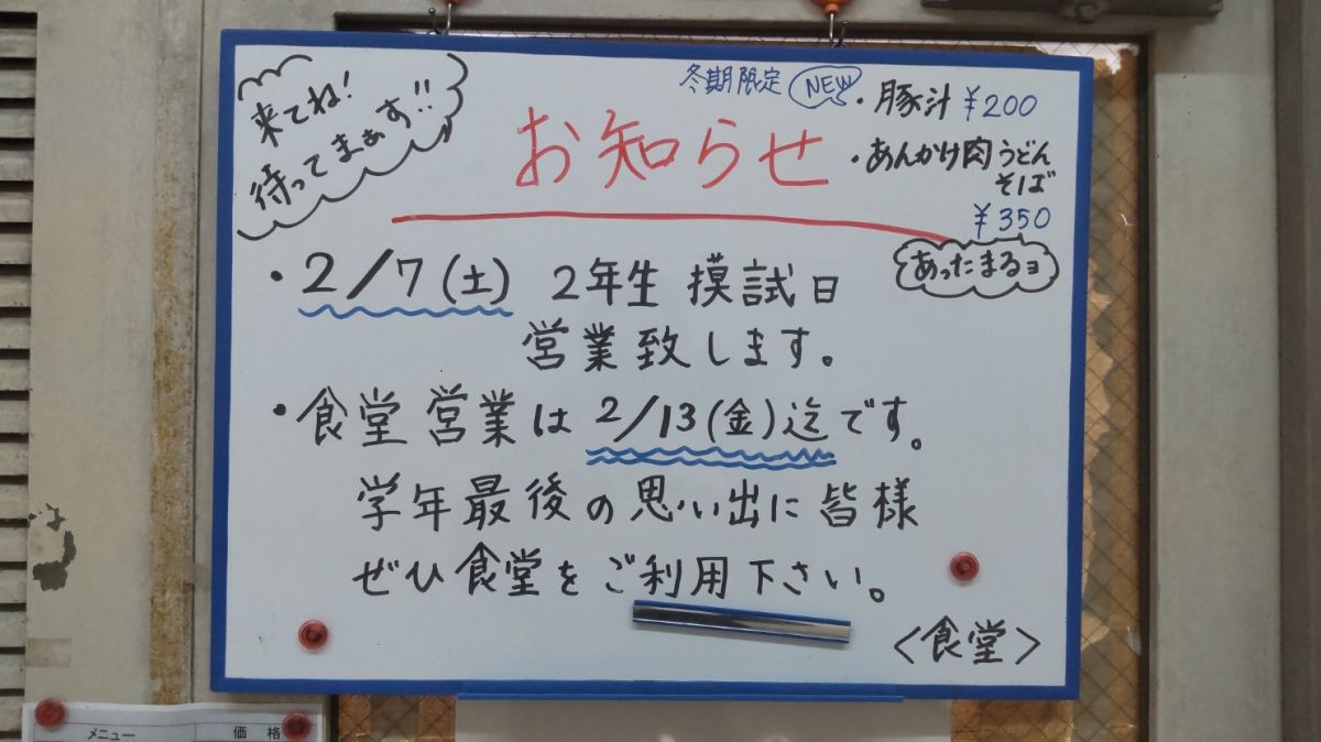 明日、2月13日(金)は食堂の本年度最終営業日です。冬のメニューも明日が食べ納です。食堂でも1年の締め括りをしてください。授業日や行事日においしい食事を作ってくださった食堂のみなさんにもお礼を言ってくださいね!